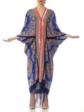 Blue Paisley Wool Cocoon Duster With Velvet Ribbon Trim