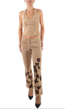 1990S Beige & Brown Floral Appliqué Suede Halter Top Pants Ensemble