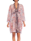 MORPHEW COLLECTION Pink Floral Print Japanese Kimono Silk Violet Detail Kaftan Short