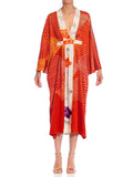 MORPHEW COLLECTION Red Shibori Japanese Kimono Silk Body Kaftan Hand Painted Cream Detailing