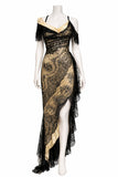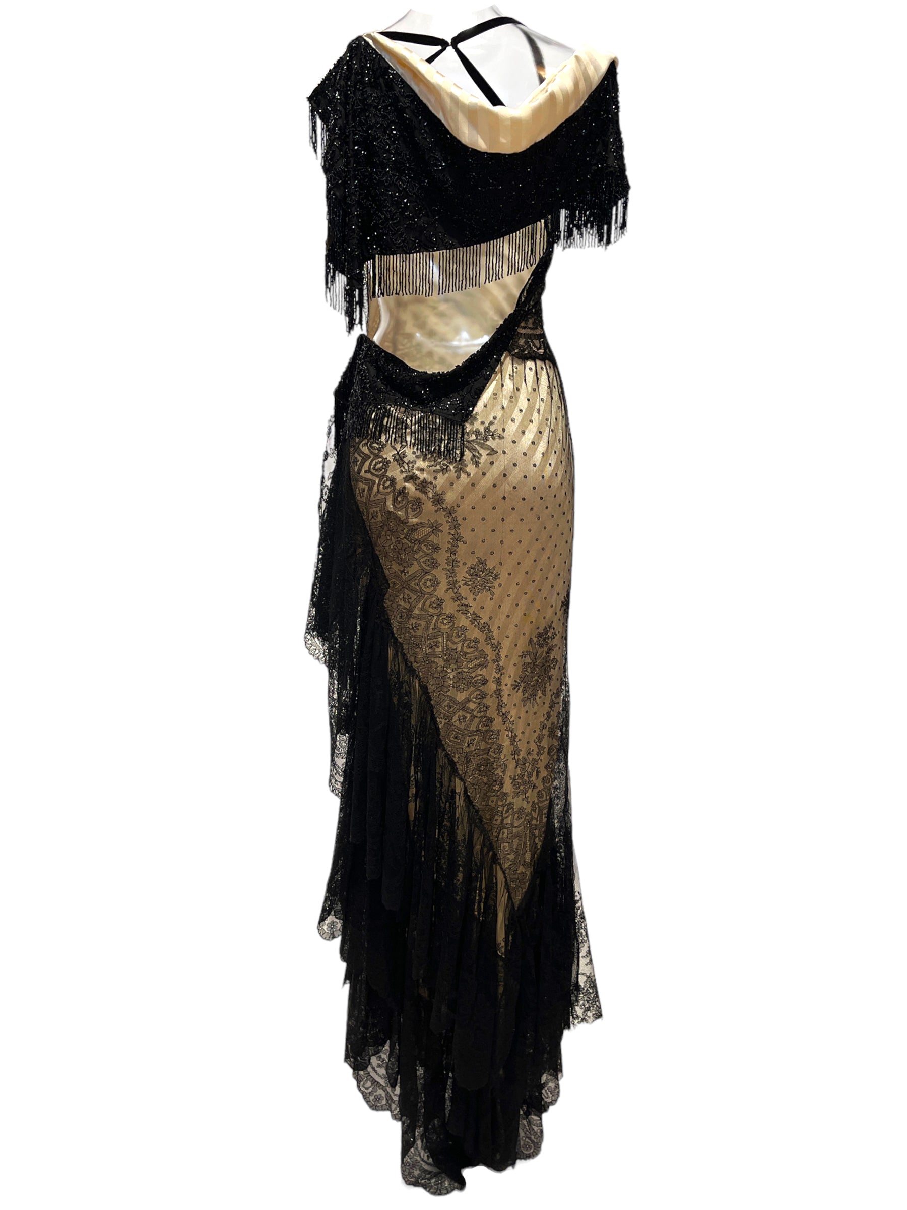 Black & Cream Silk Chantilly Lace Trained Gown With Victorian Beaded Fringe