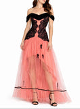 Salmon Pink & Black Rayon Blend Tulle Lace Gown With Velvet Bow Neckline