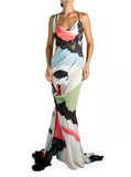 This gown is made form upcycled vintage Japanese kimono silk which is hand-dyed to create beautiful ombré swatches of color. These are combined with a picturesque vintage Japanese crepe scarf and trimmed in vintage alencon lace. Draped as a one-of-a-kind gown on our size 6 dress form, the bias cut allows for a variety of sizing.