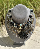 1950S MORPHEW ATELIER Mixed Media Net Like Necklace With Black And Clear Beads 1960S Floral Pins