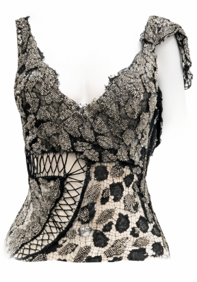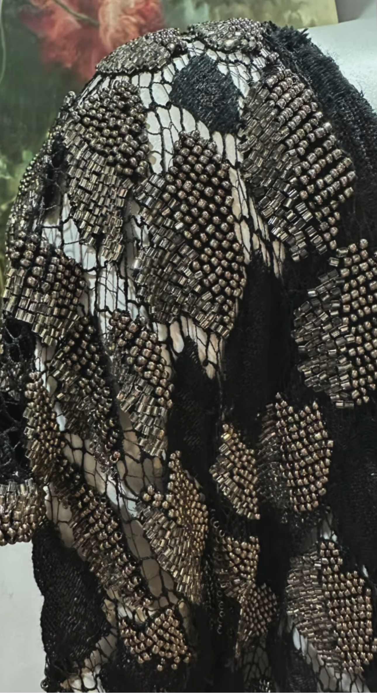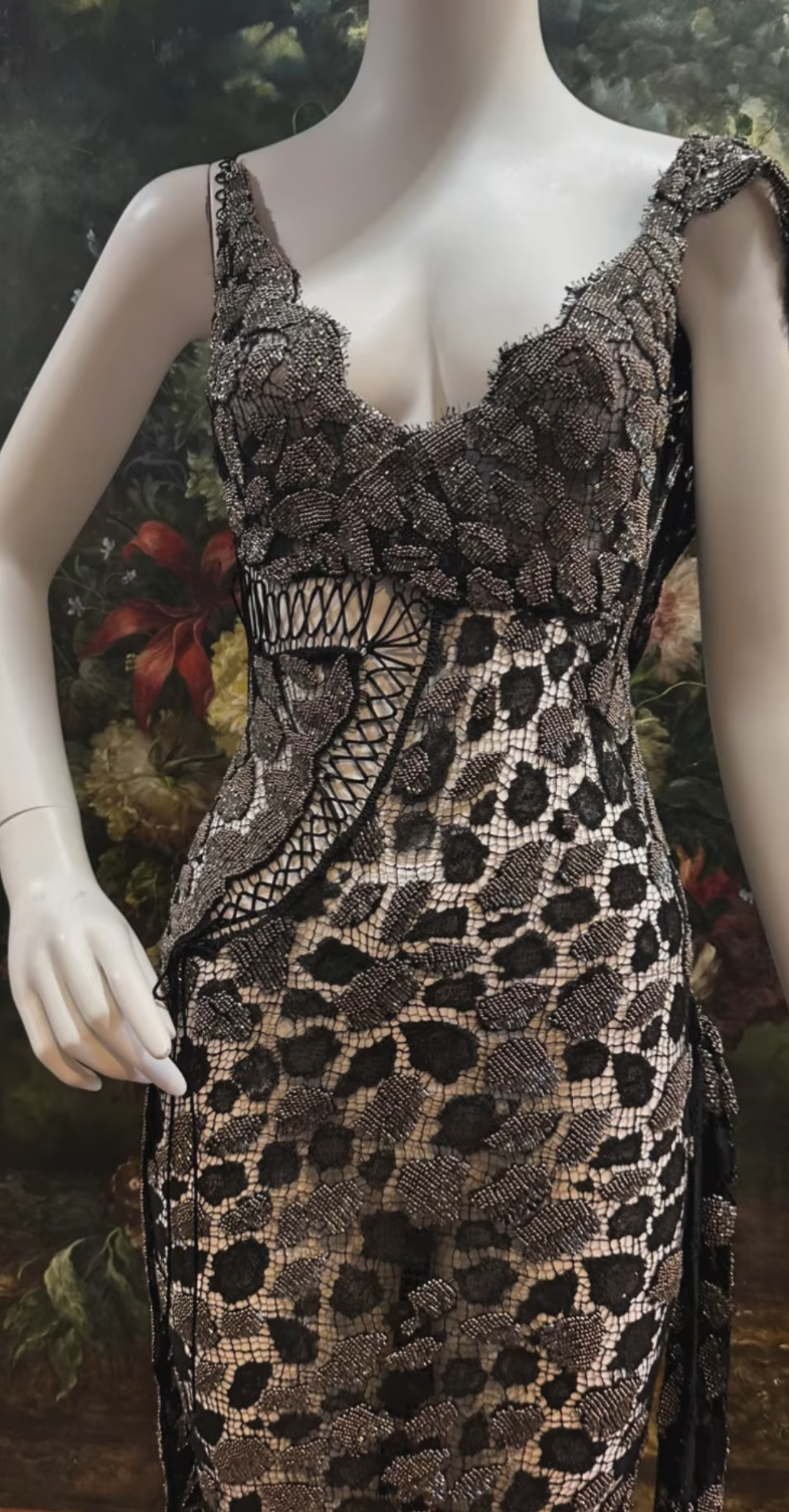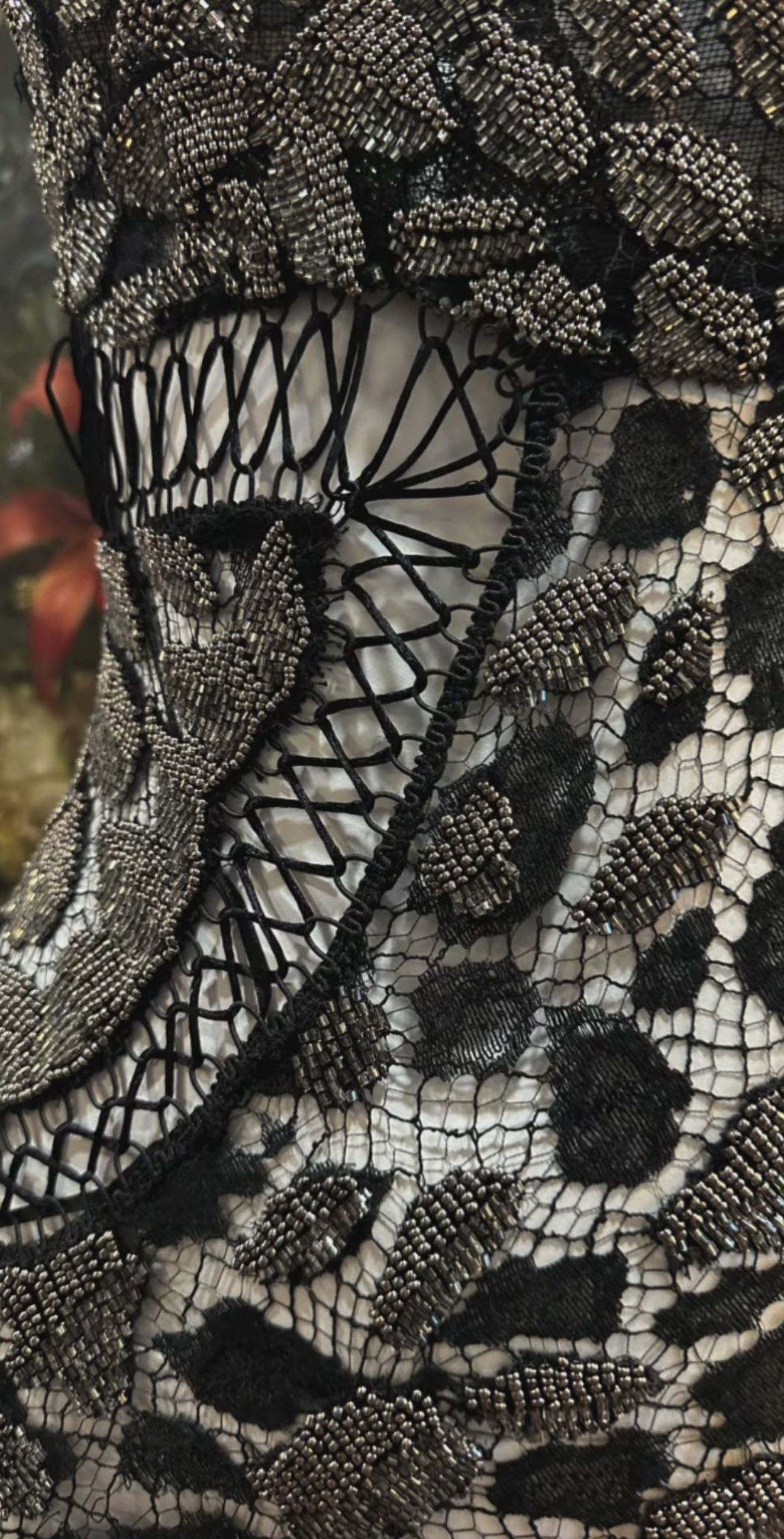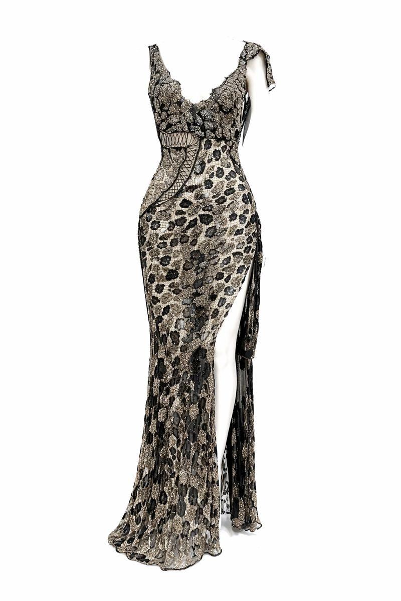 Black Sheer French Lace Gown with Grey Metal Beading