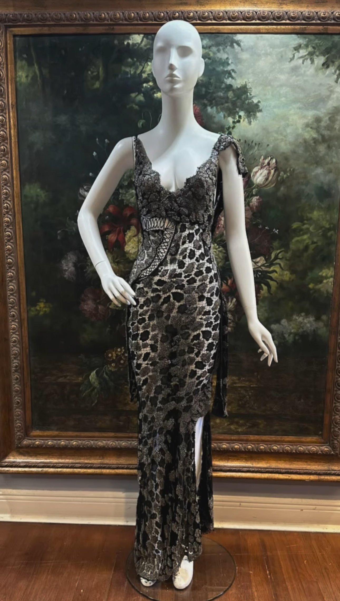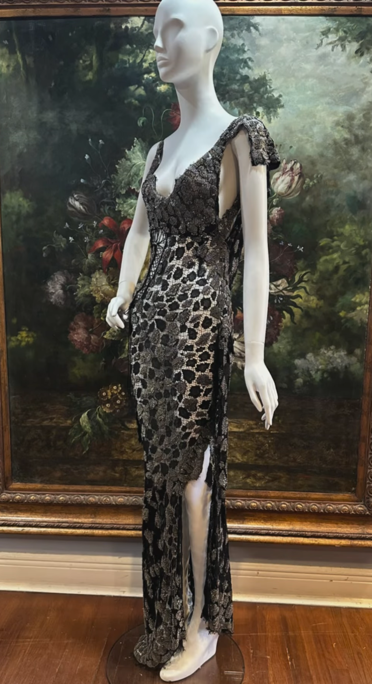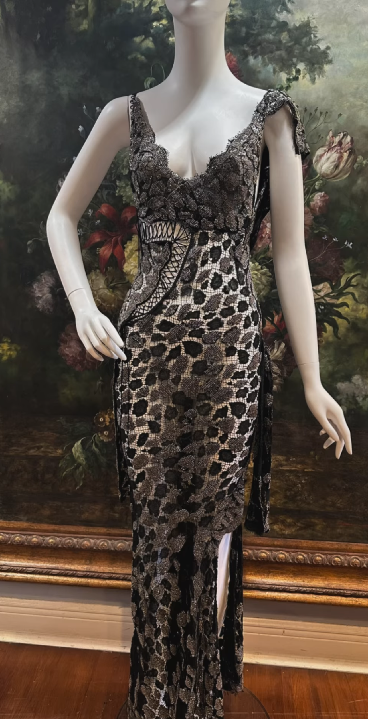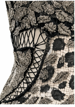 MORPHEW ATELIER Black Sheer French Lace Gown with Grey Metal Beading
