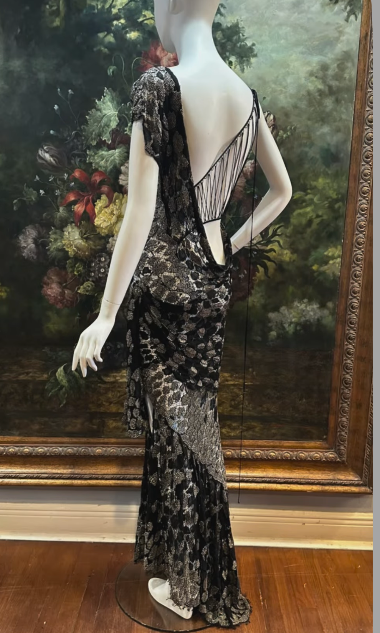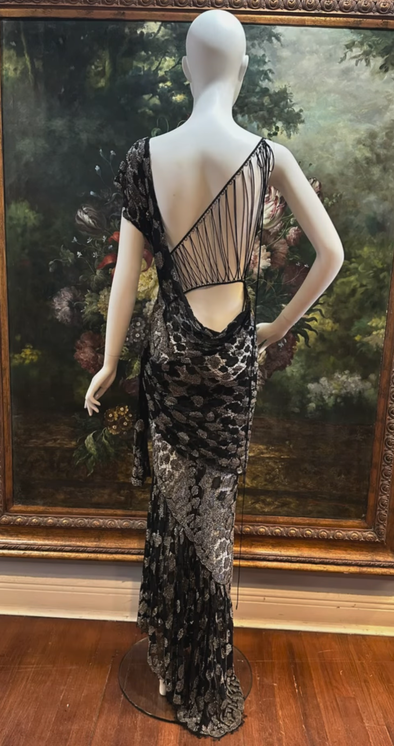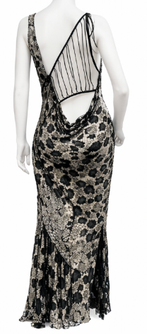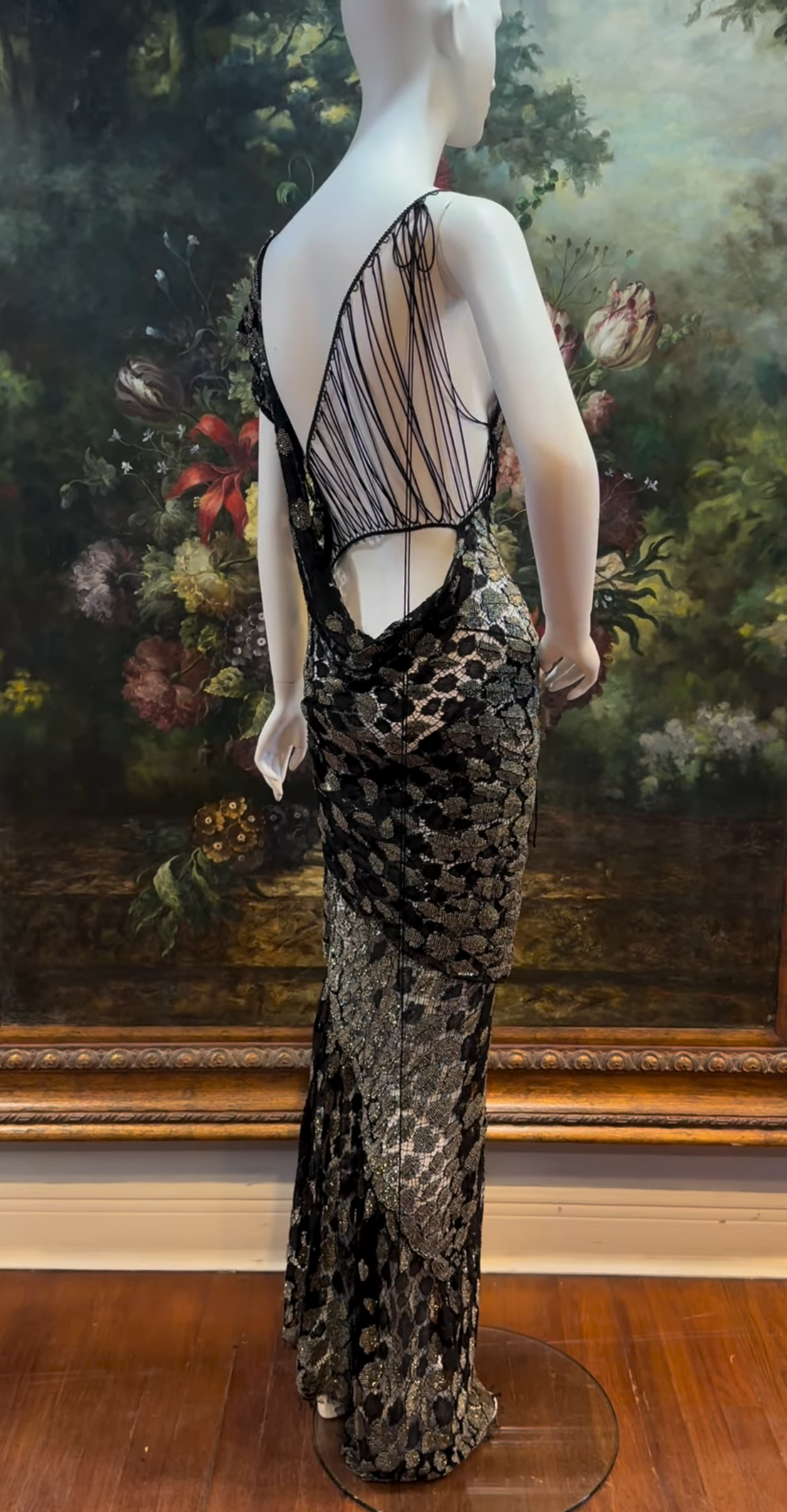 MORPHEW ATELIER Black Sheer French Lace Gown with Grey Metal Beading