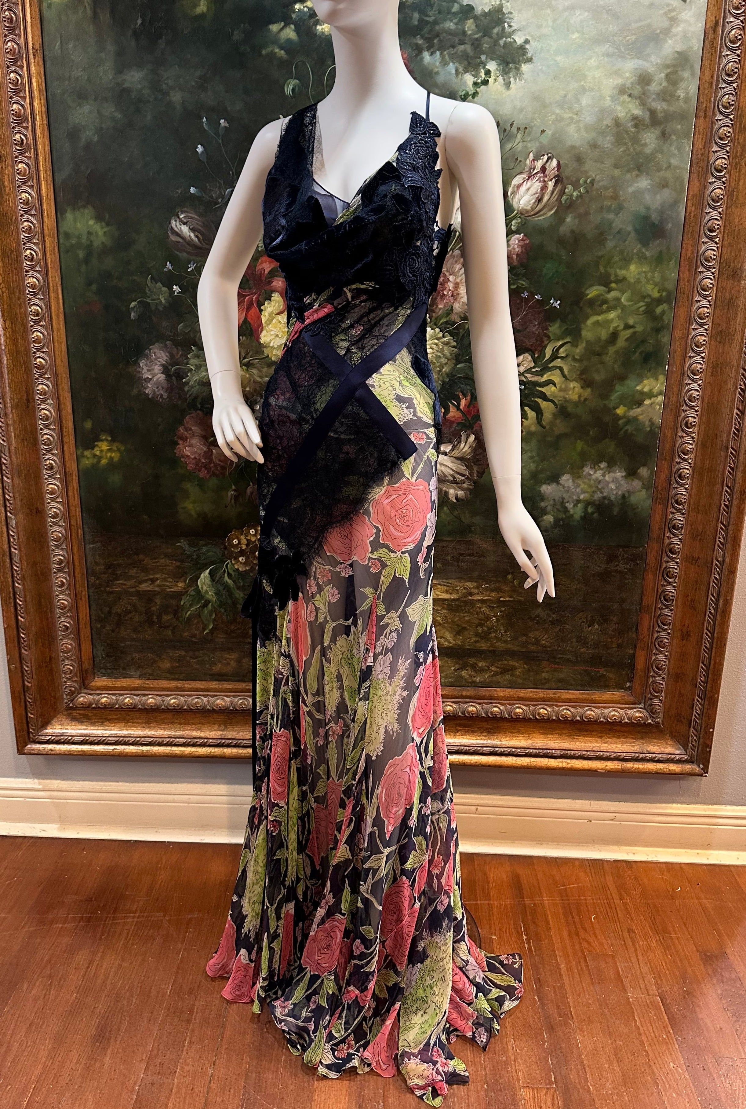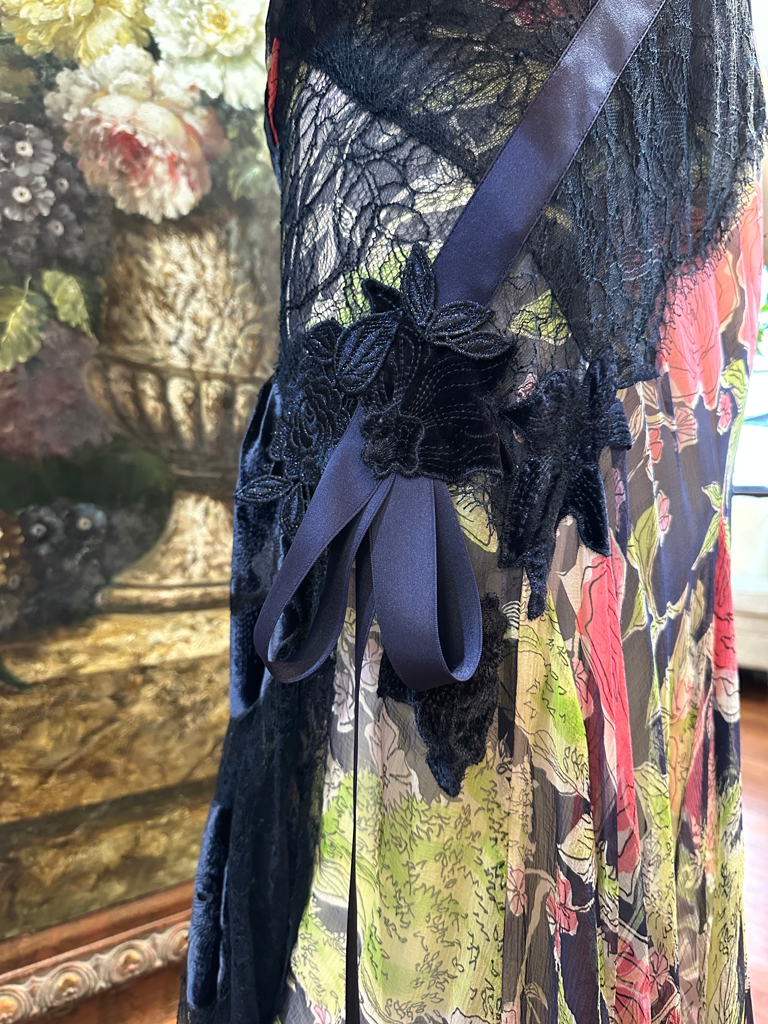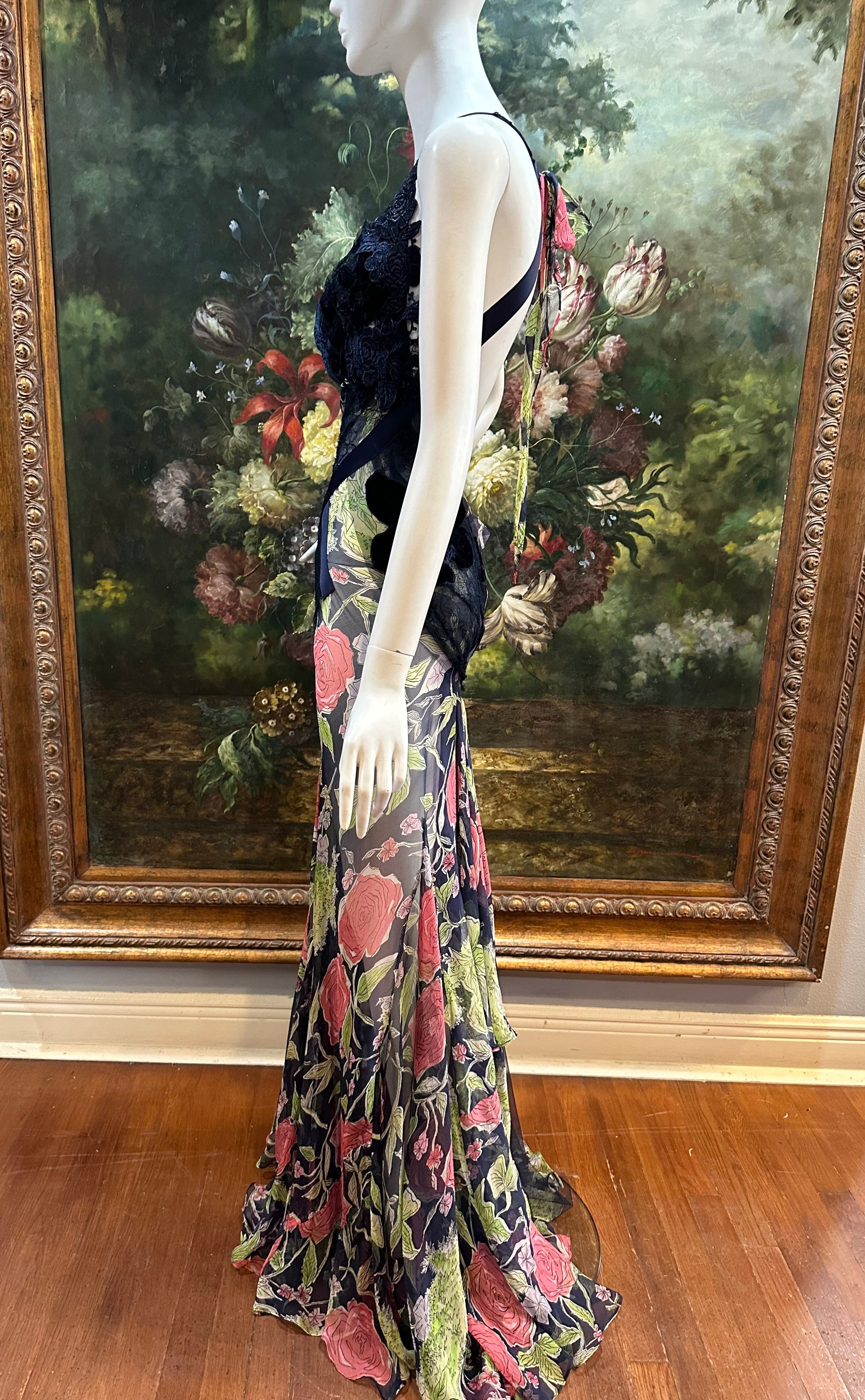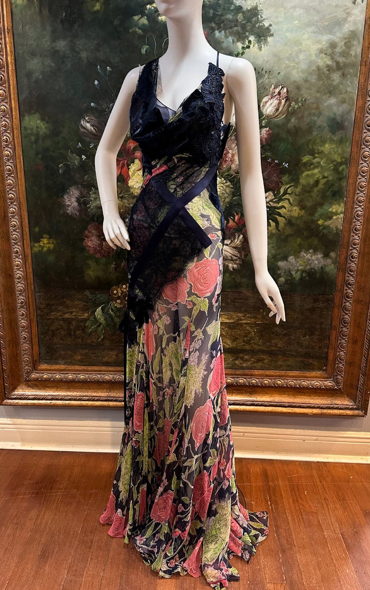 MORPHEW ATELIER Navy Blue & Pink Silk Chiffon & Lace Gown with Velvet Floral Appliqué Size 4