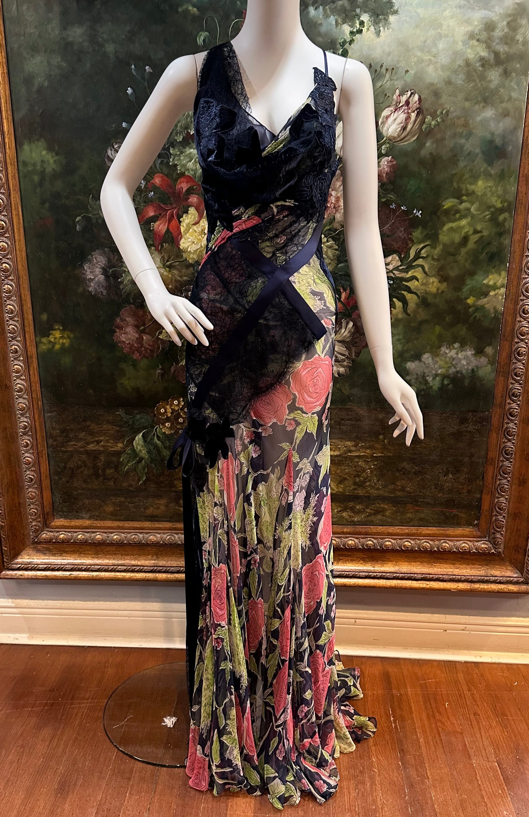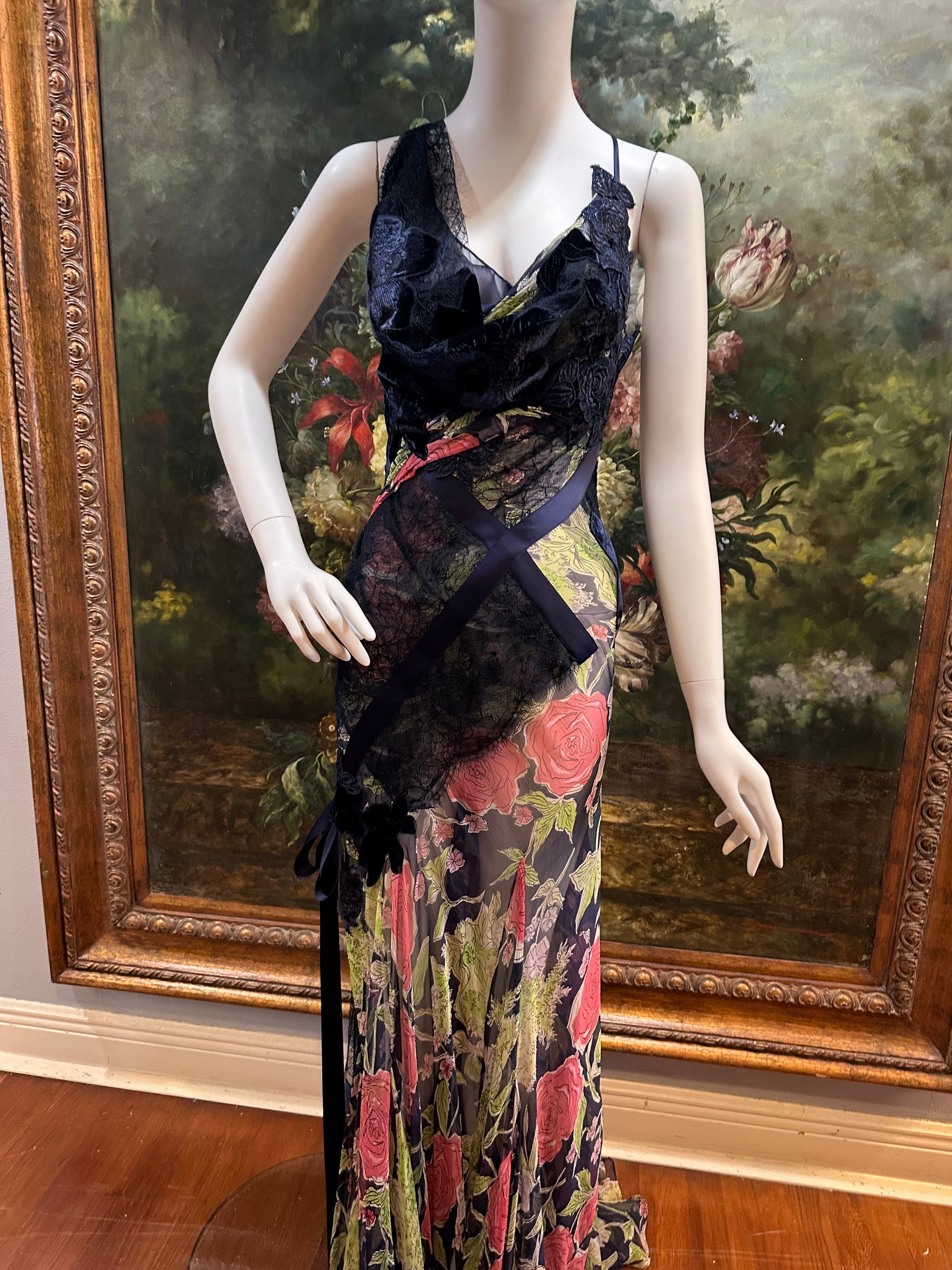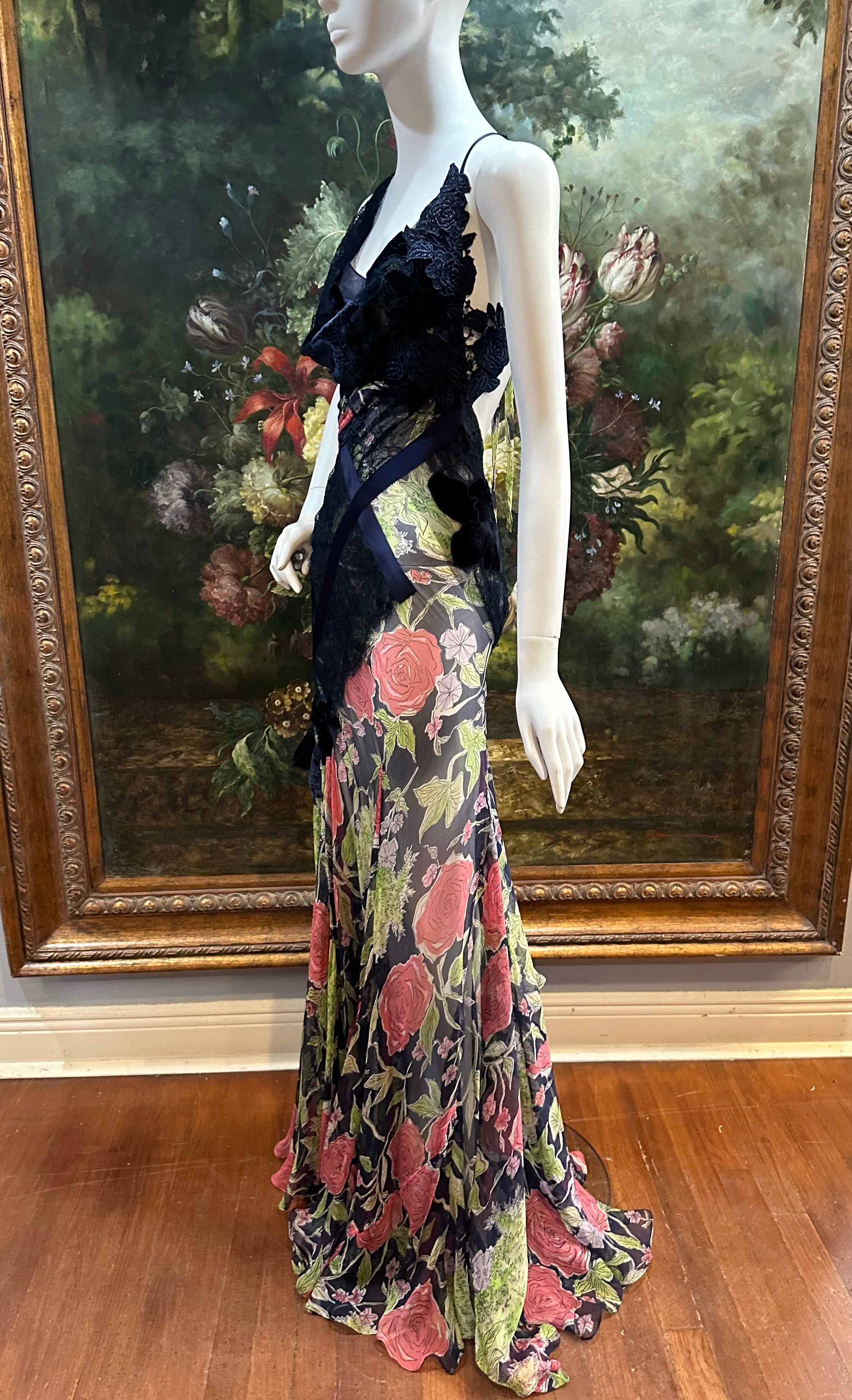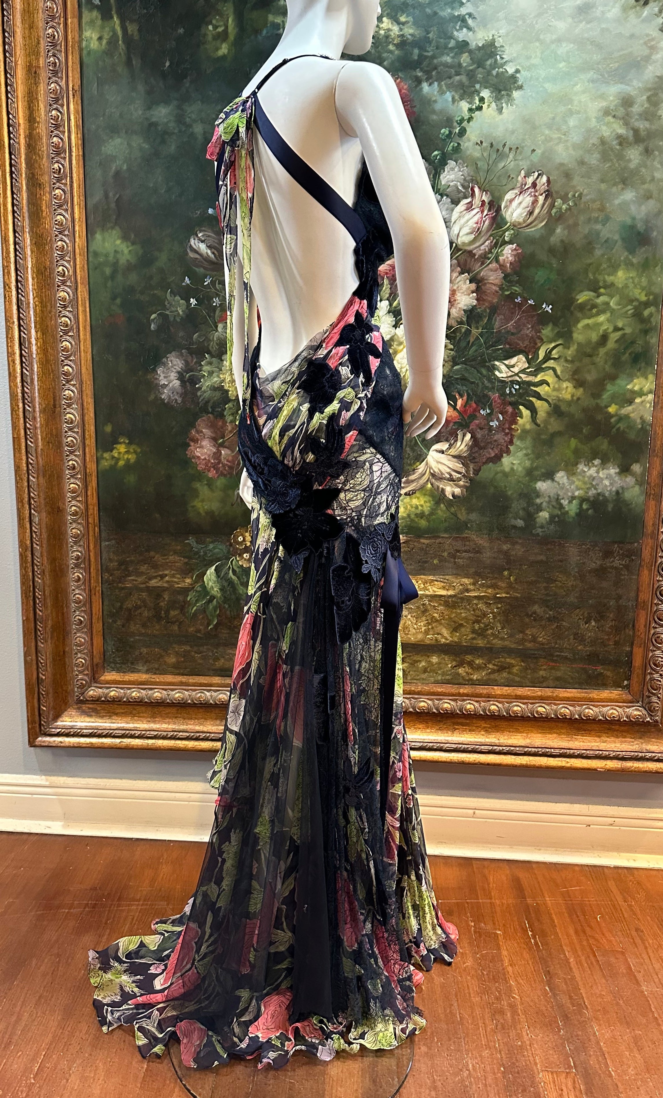 MORPHEW ATELIER Navy Blue & Pink Silk Chiffon & Lace Gown with Velvet Floral Appliqué Size 4