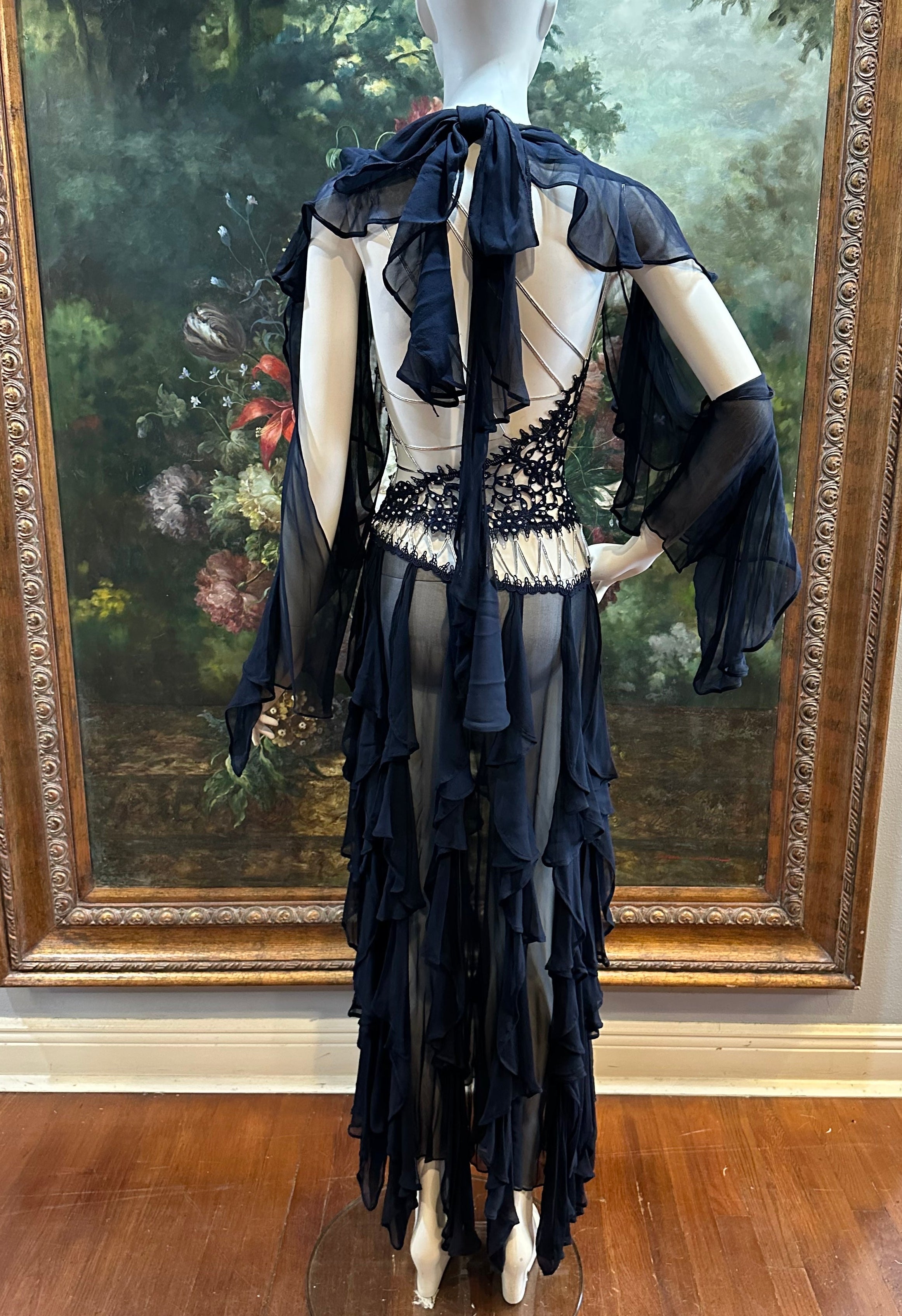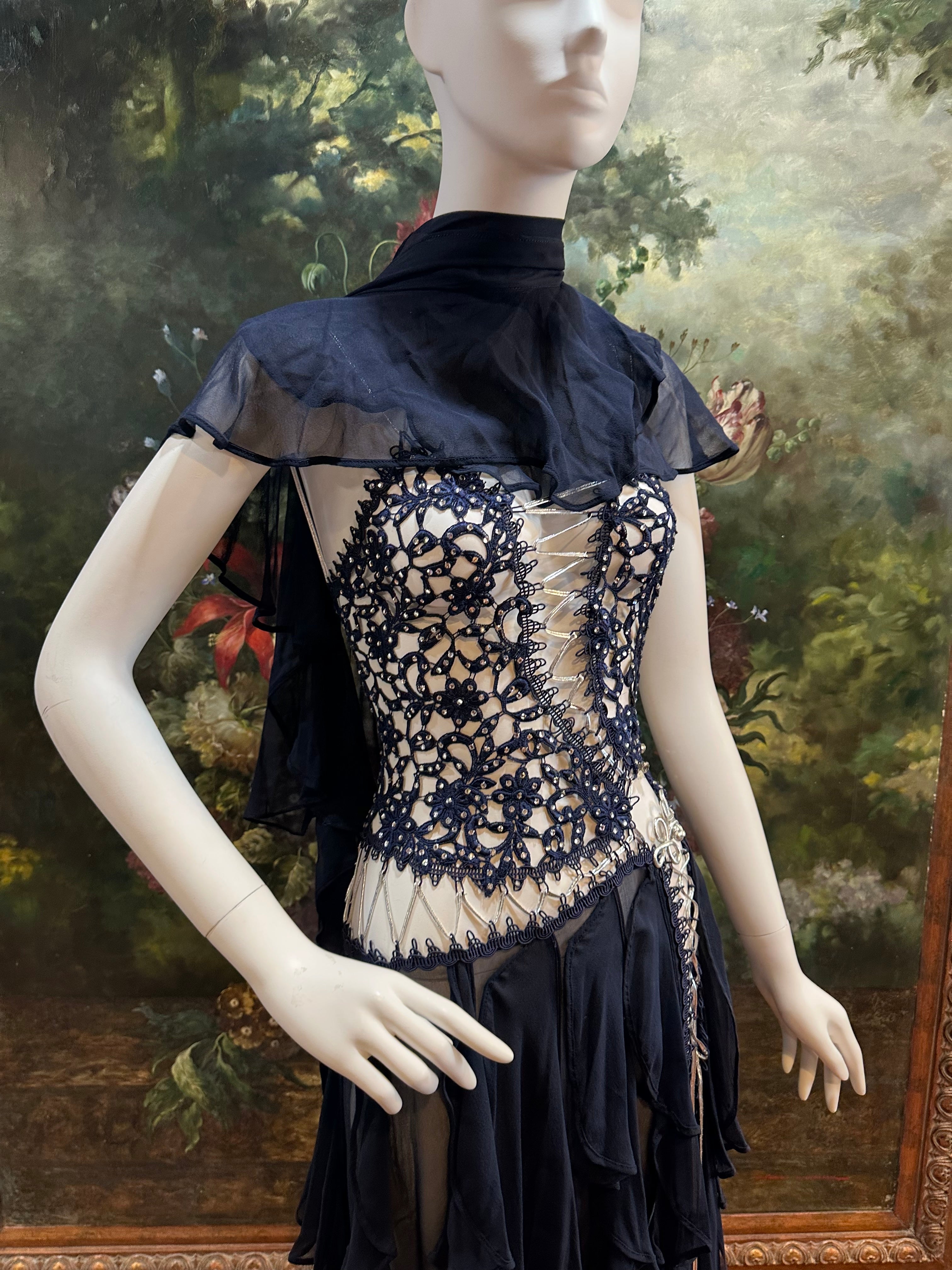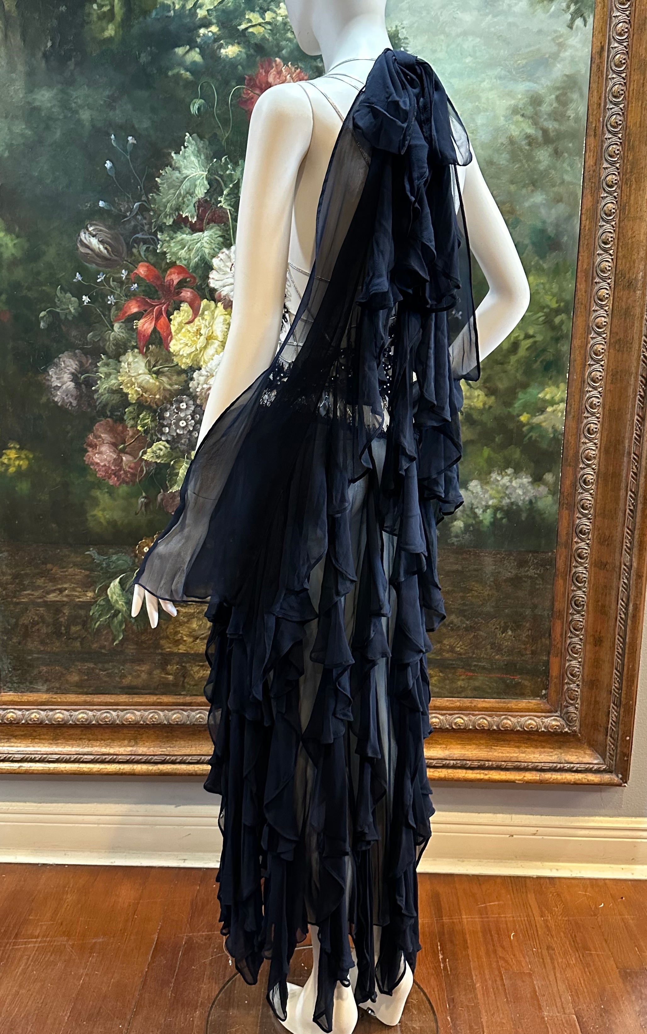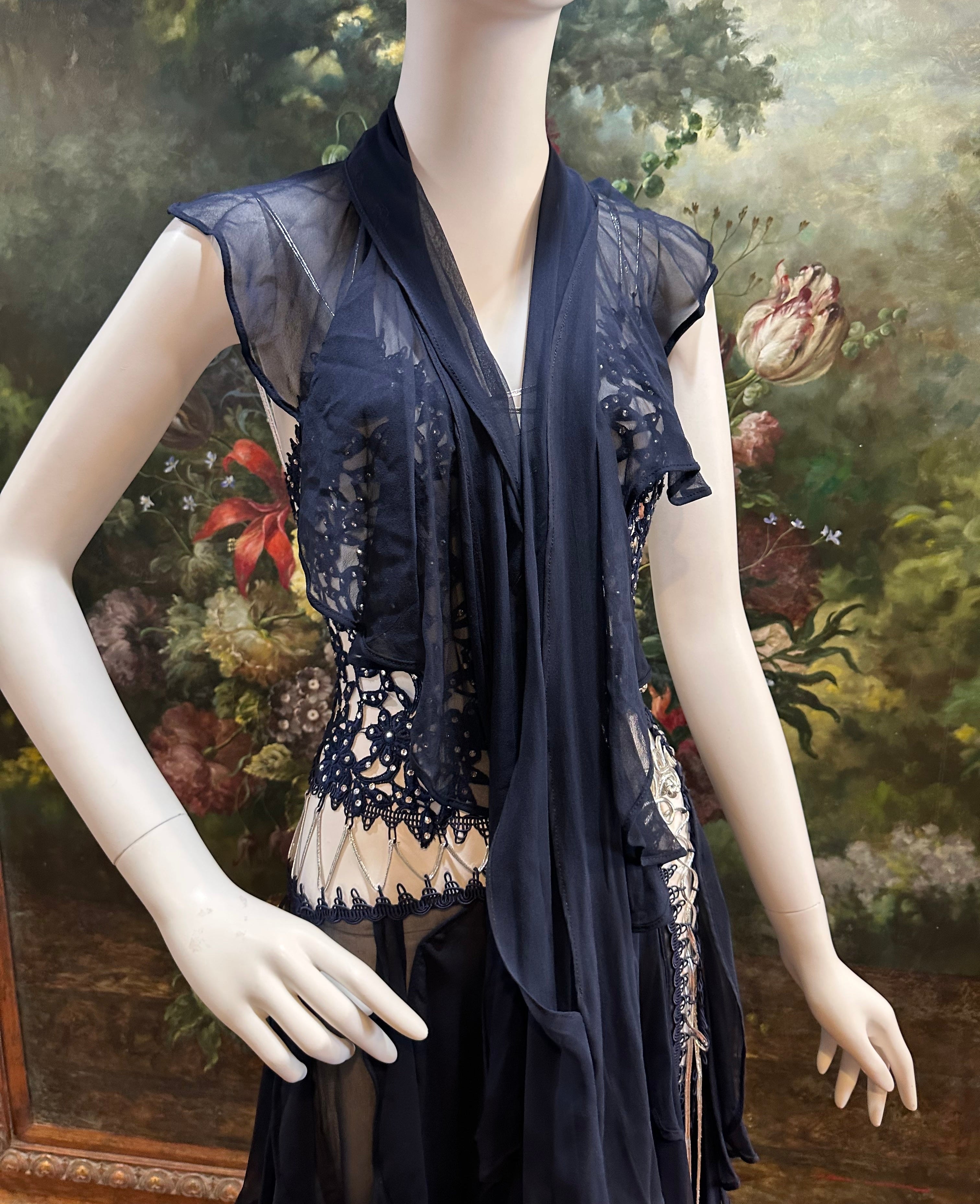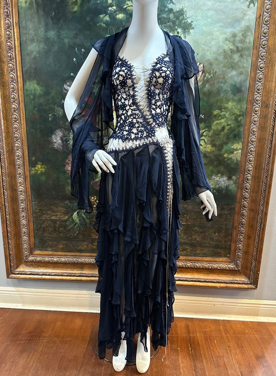 Navy Blue Silk Chiffon & Crystal Beaded Lace Gown Size 4