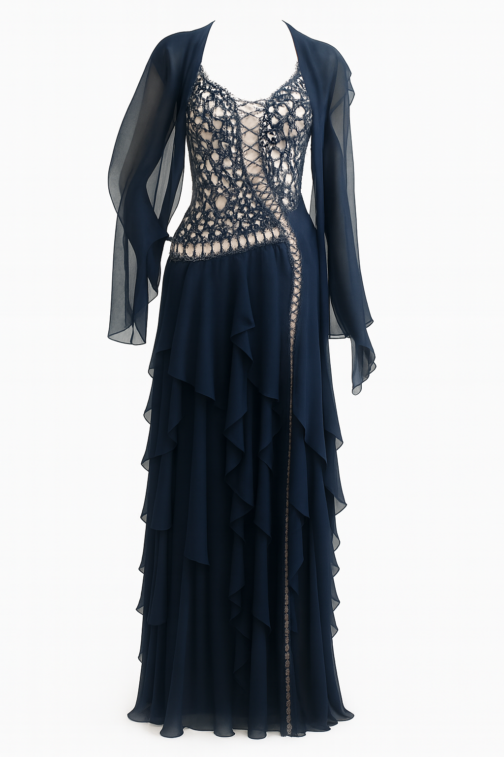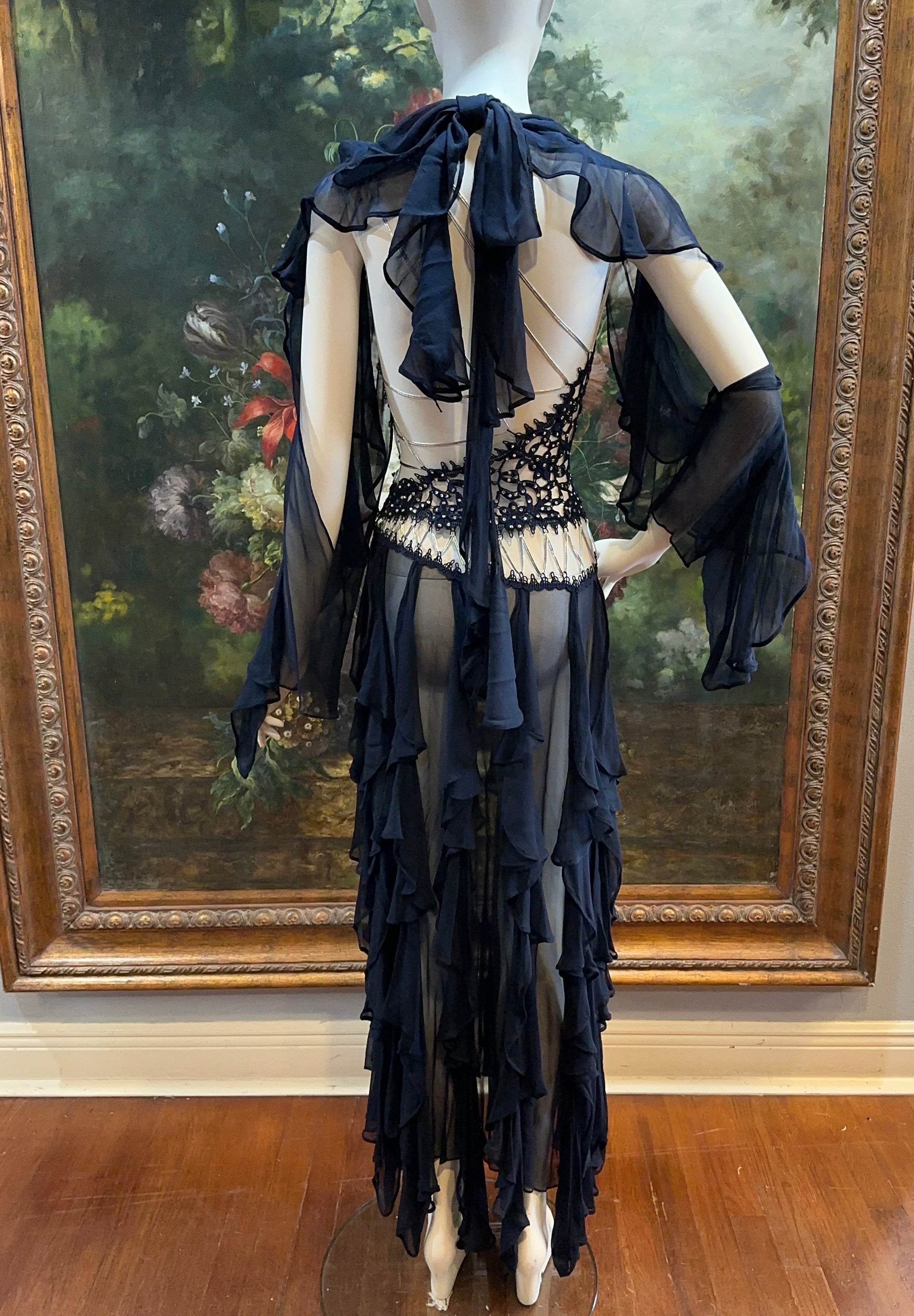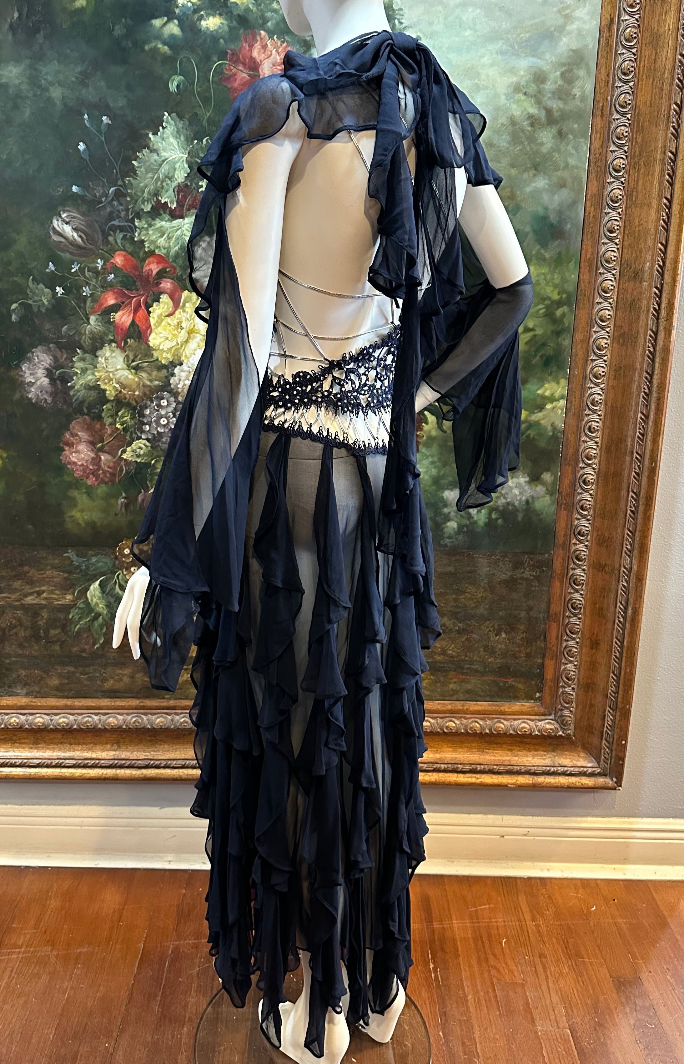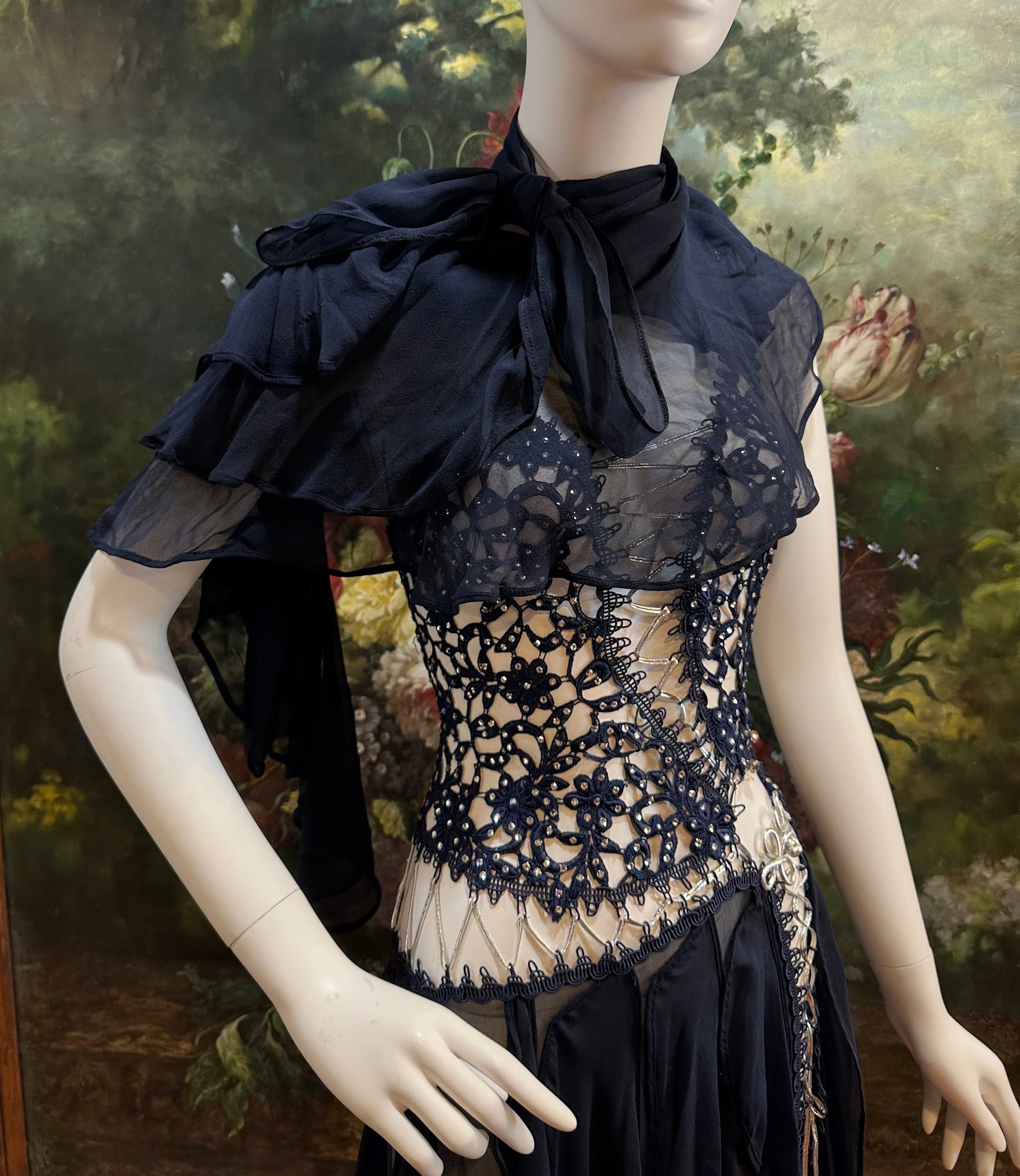 Navy Blue Silk Chiffon & Crystal Beaded Lace Gown Size 4