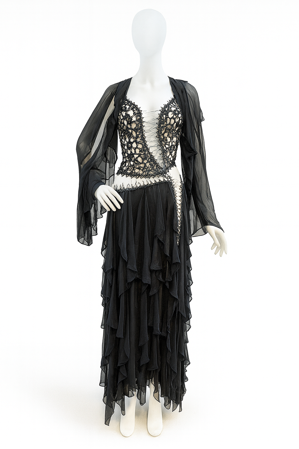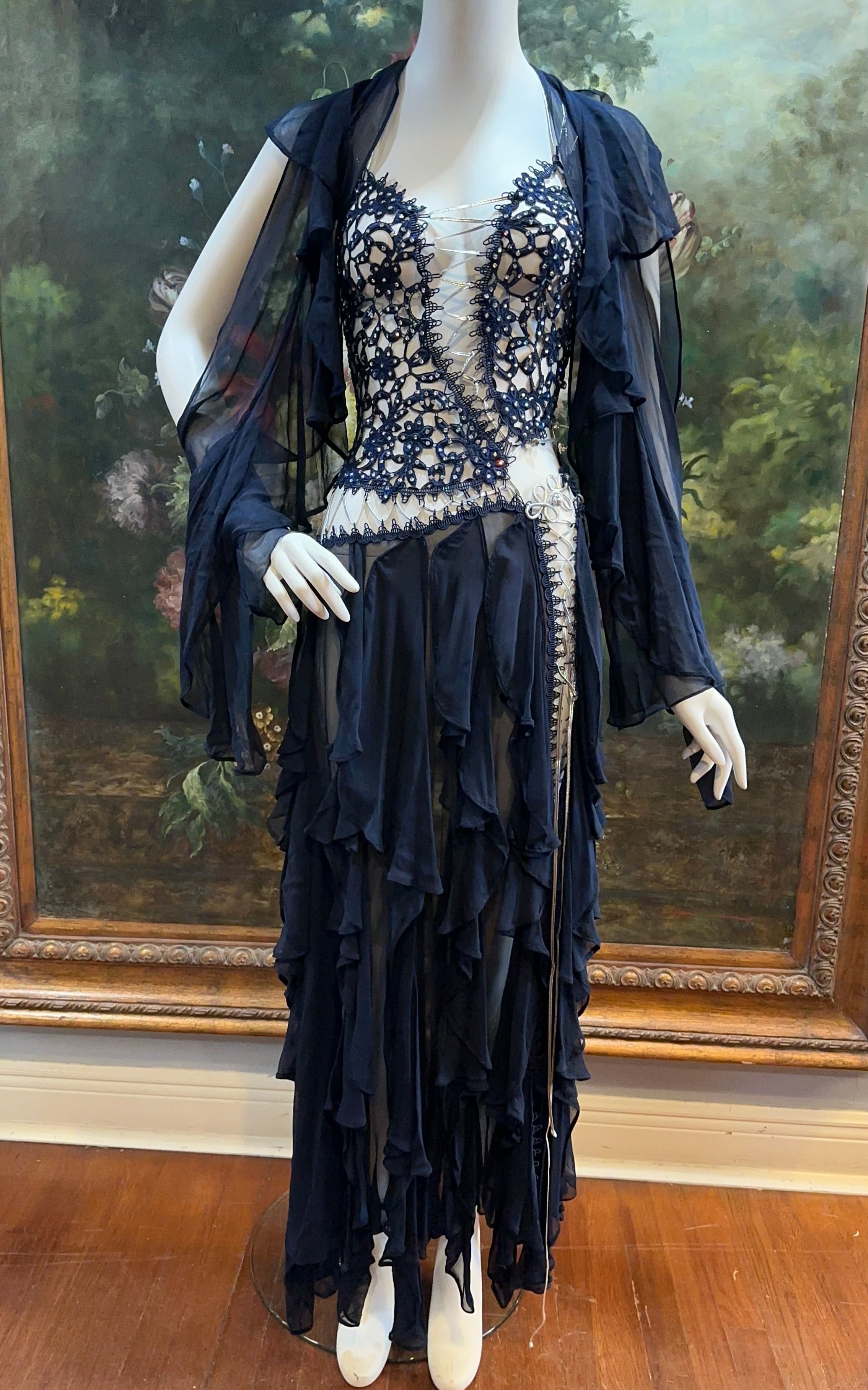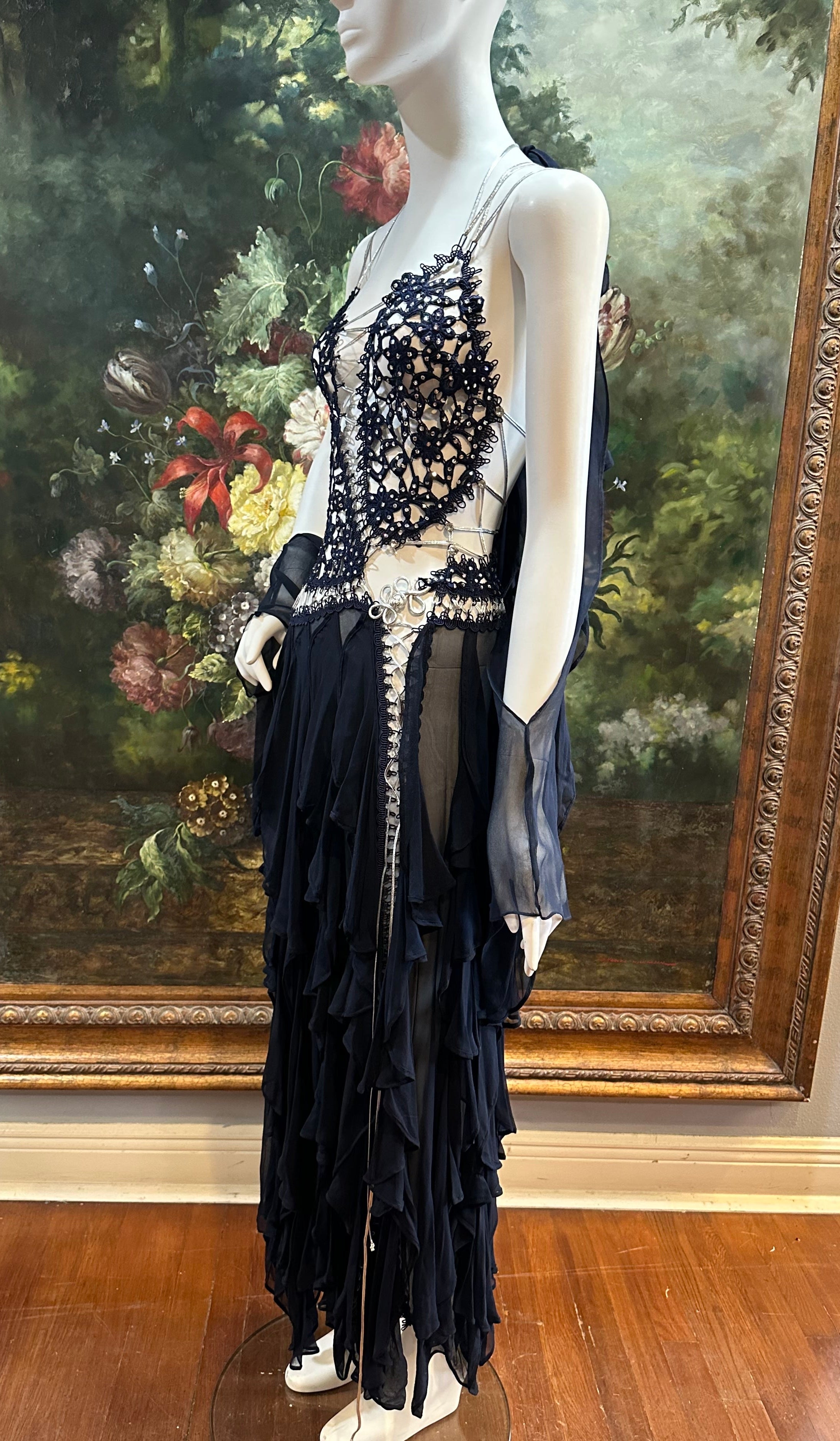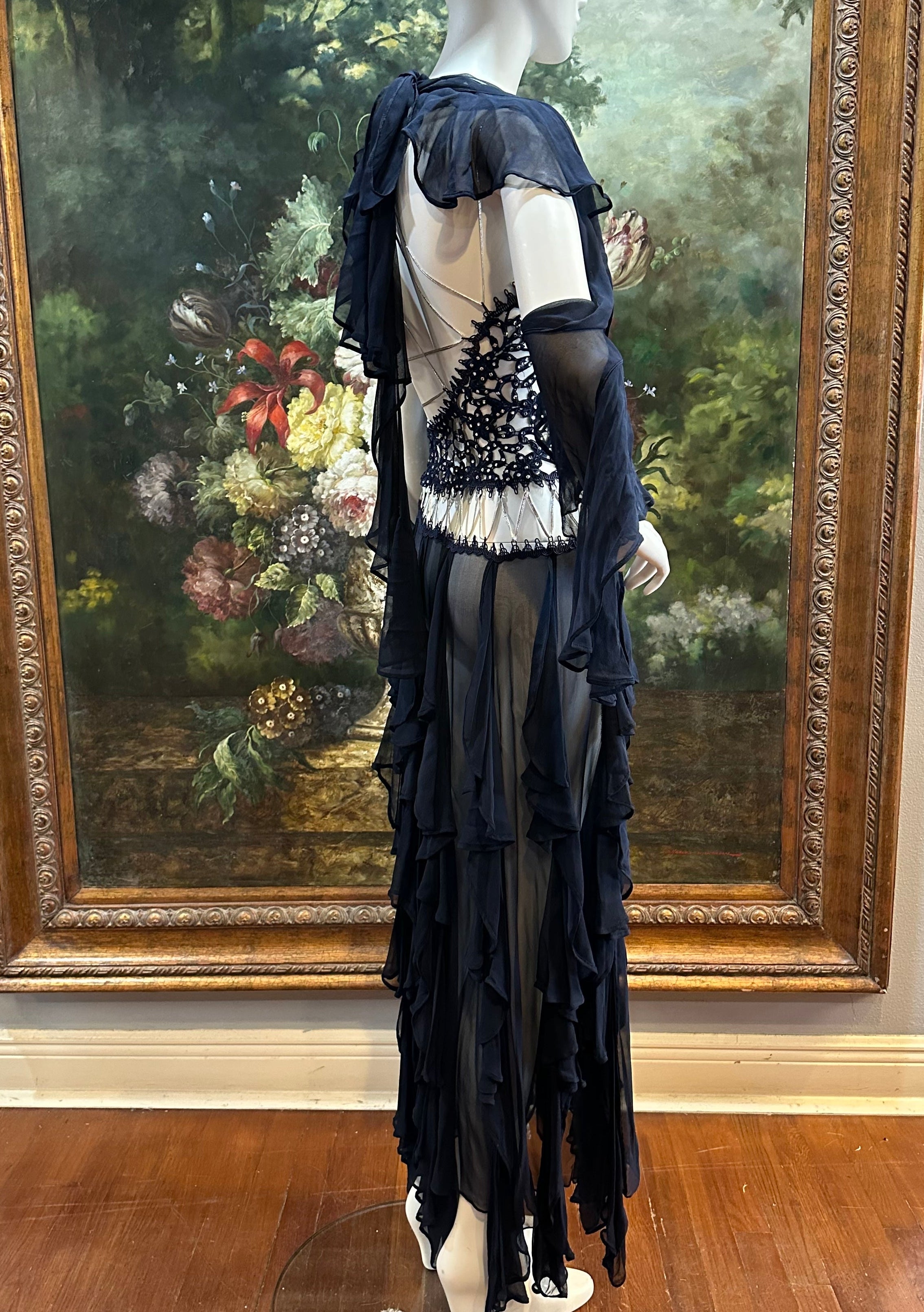 MORPHEW ATELIER Navy Blue Silk Chiffon & Crystal Beaded Lace Gown Size 4