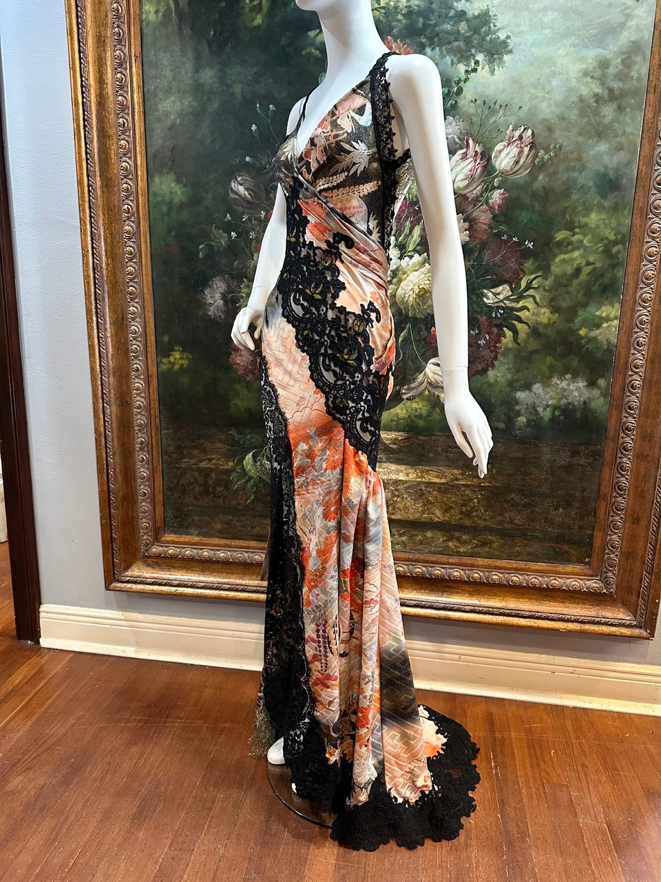 Persimmon & Black Japanese Silk & Patchwork Lace Gown with Hurricane Patina Size 4
