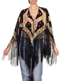 1920S Black & Peach Silk Chiffon Vegetal Medallion Motif Piano Shawl