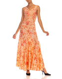 1930S Pink & Orange Floral Rayon Asymmetrical Bias Cut Dress