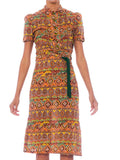 1940S Ethnic Medallion Printed Cotton Seersucker Button Front Dress With Tie Belt