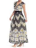 1970S Black & White Cotton Voile Flower Power Daisy Print Ruffled Lace Dress