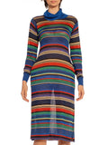 1970S Blue Red & Yellow Lurex Knit Striped Turtle Neck Dress