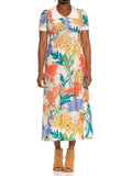 1970S Yellow & Blue On White Floral Polyester Jersey Empire Waist Dress With Sash Ties