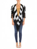 MORPHEW COLLECTION Black & White Suede Fringe Feather Leather Long Cape