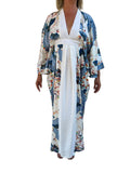 Blue & White Japanese Kimono Silk Fan Print Kaftan