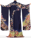 1970S Navy Blue Japanese With Gold Flowers Kimono