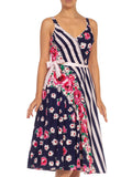2000S Navy Blue White & Pink Cotton Stripe Floral Printed Dress Linen With Bra