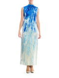 This gown is made from some of the most expensive fabric one could ever buy. The rich silk has been woven into a luscious duchess satin. Then the silk is delicately cut on the surface with razors to turn the satin in areas into velvet! Then after this the fabric was hand printed with a water color brushstroke print, aligned right on top of the velvet brushstrokes. The designer who made this gown understood the cost of this fabric and in the most genius of ways they made this dress with only one seam! The fit comes from the shaping of the fabric with diagonal darts which control the fabric as it wraps around the body to the center seam in the back. The center back becomes another feature with the addition of 5 elegant bows. Fully lined in silk/
