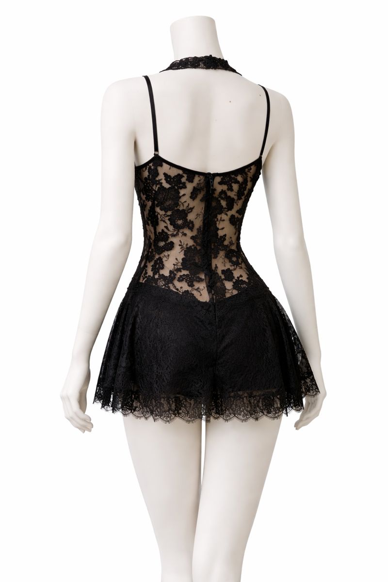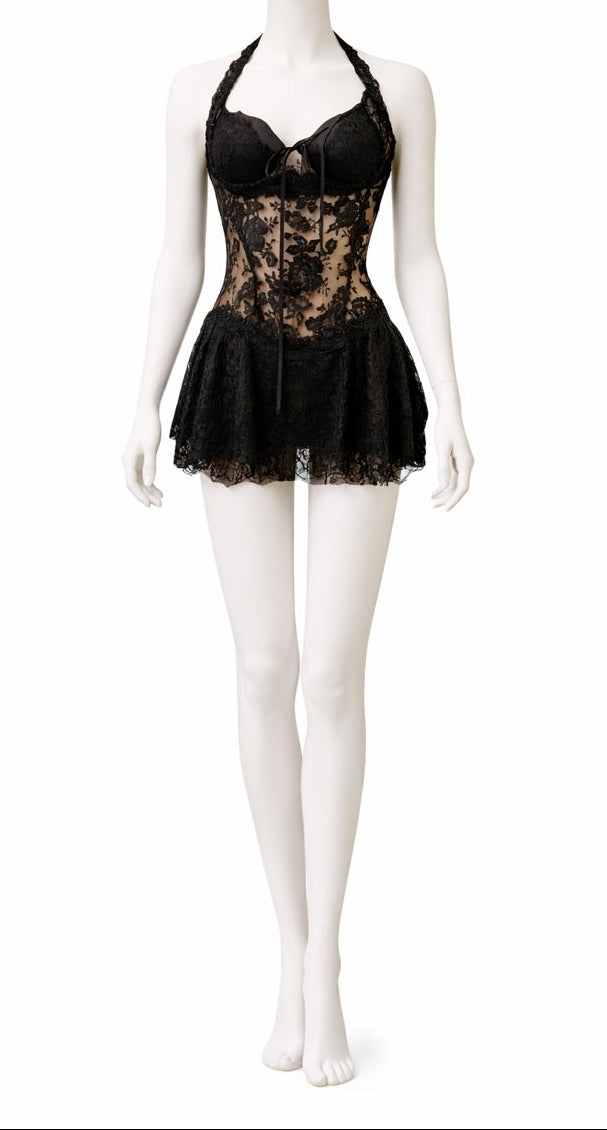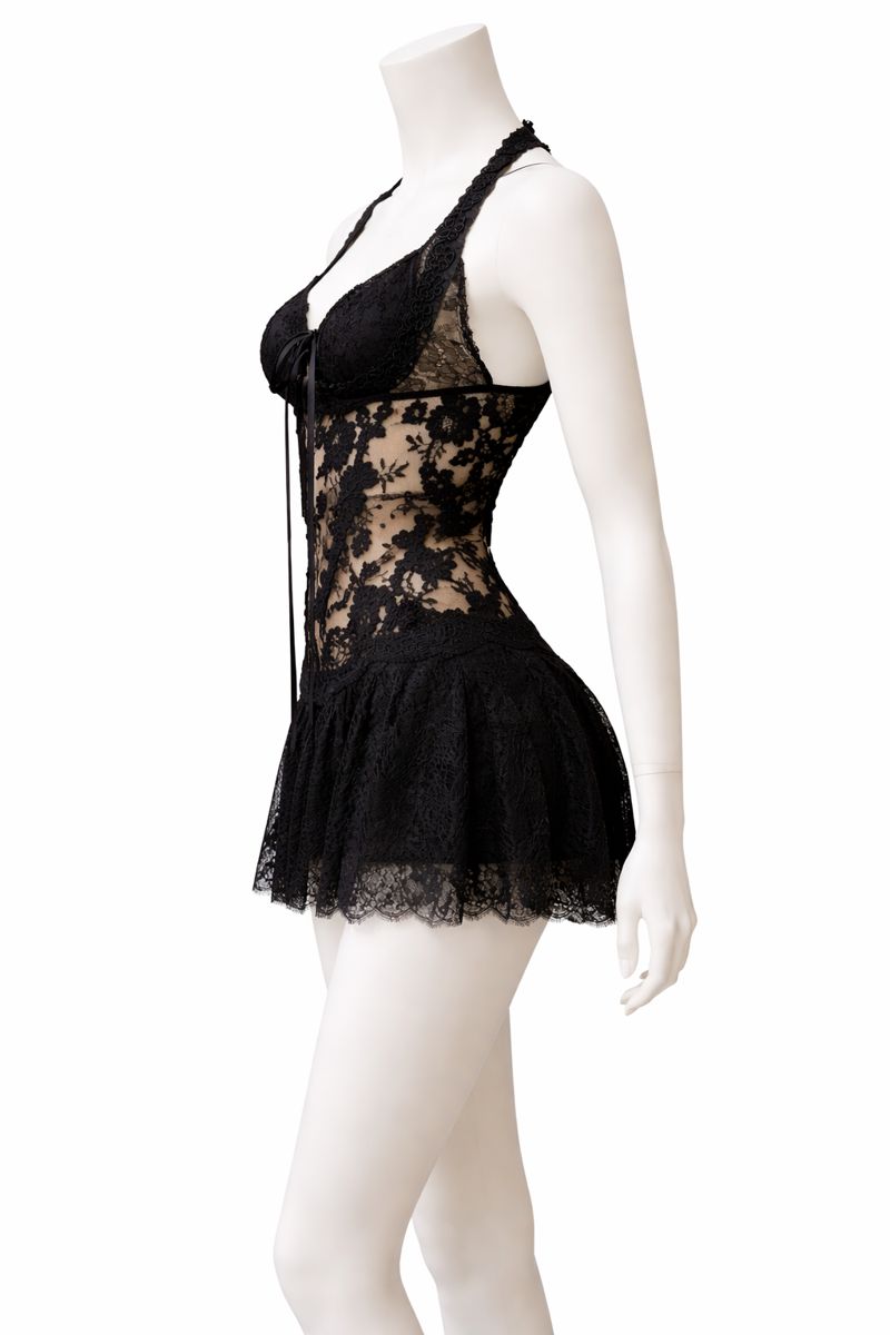 Black French Silk Chantilly Lace Cocktail Dress with Black Ribbon Bow