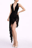 Black Sheer Lace Antique Beaded Fringe Halter Cocktail Dress