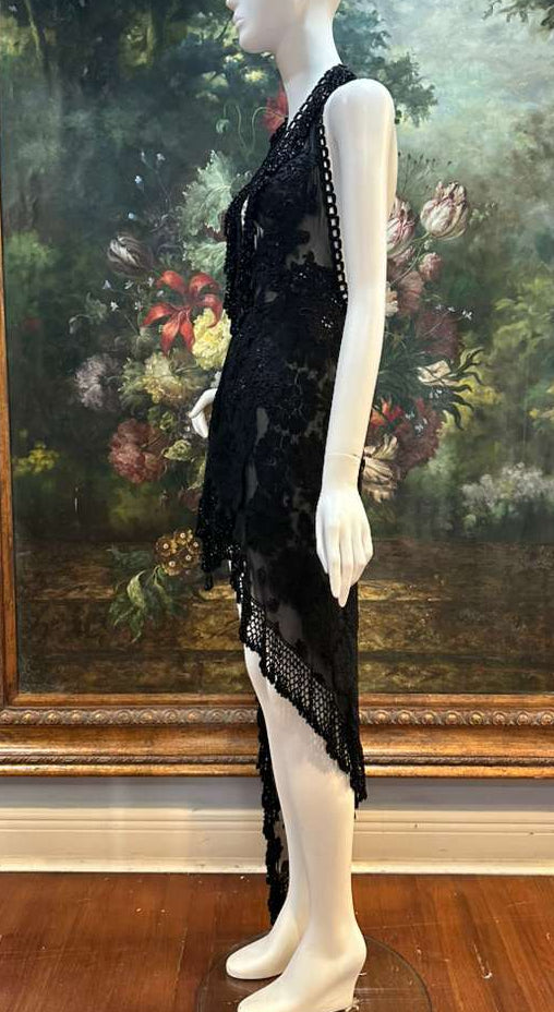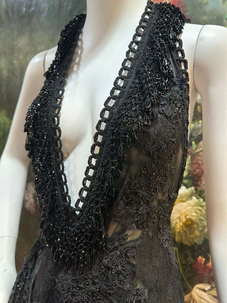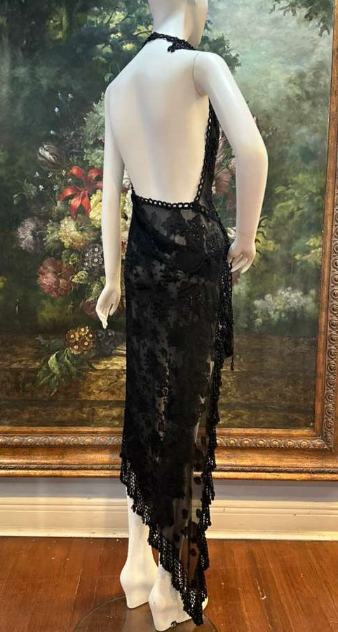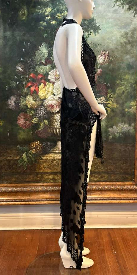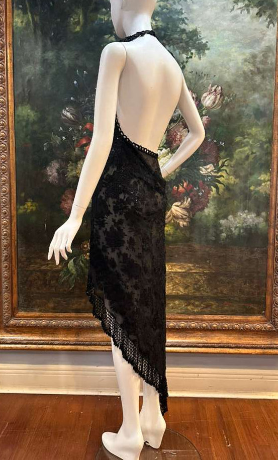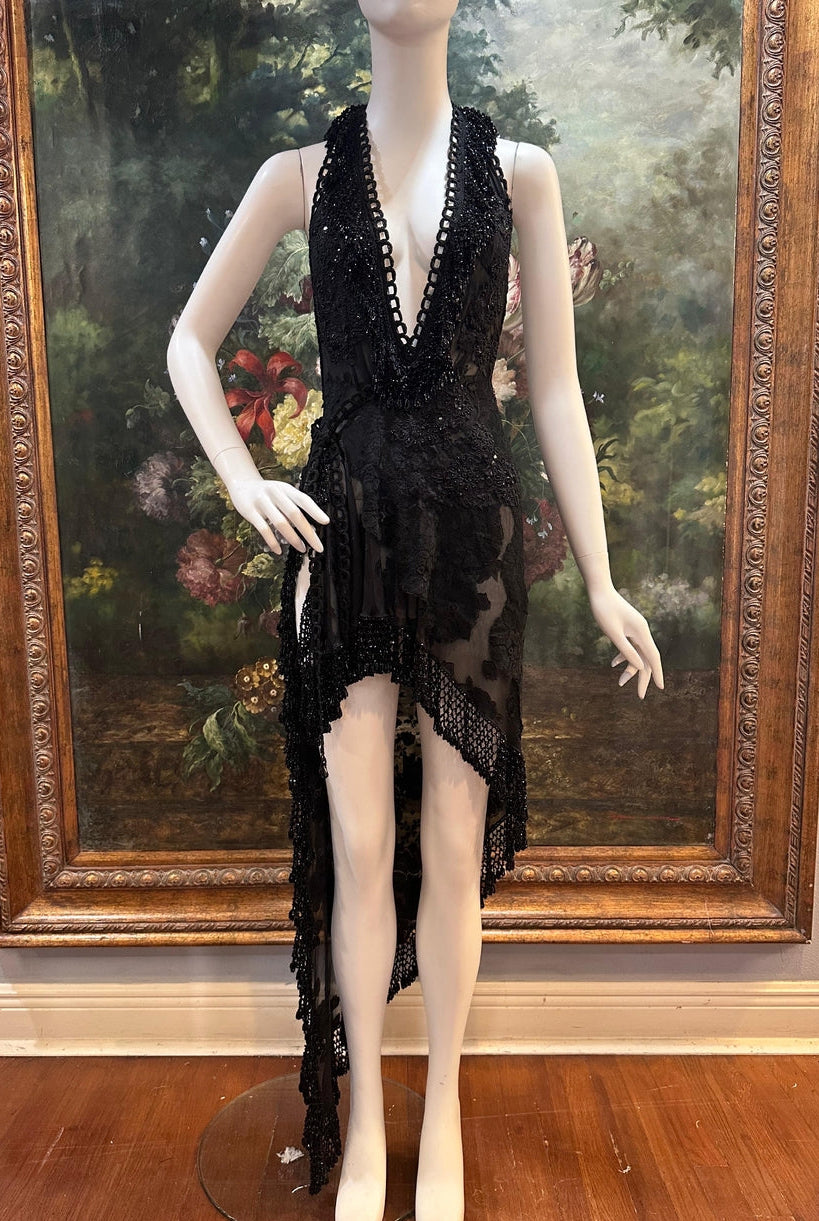 MORPHEW ATELIER Black Sheer Lace Antique Beaded Fringe Halter Cocktail Dress