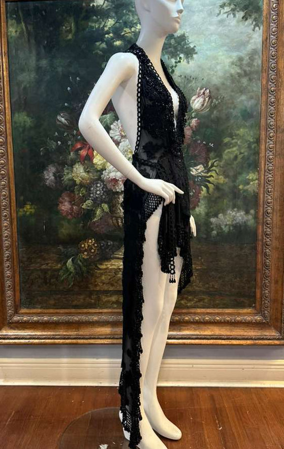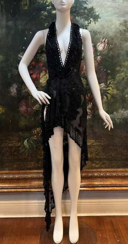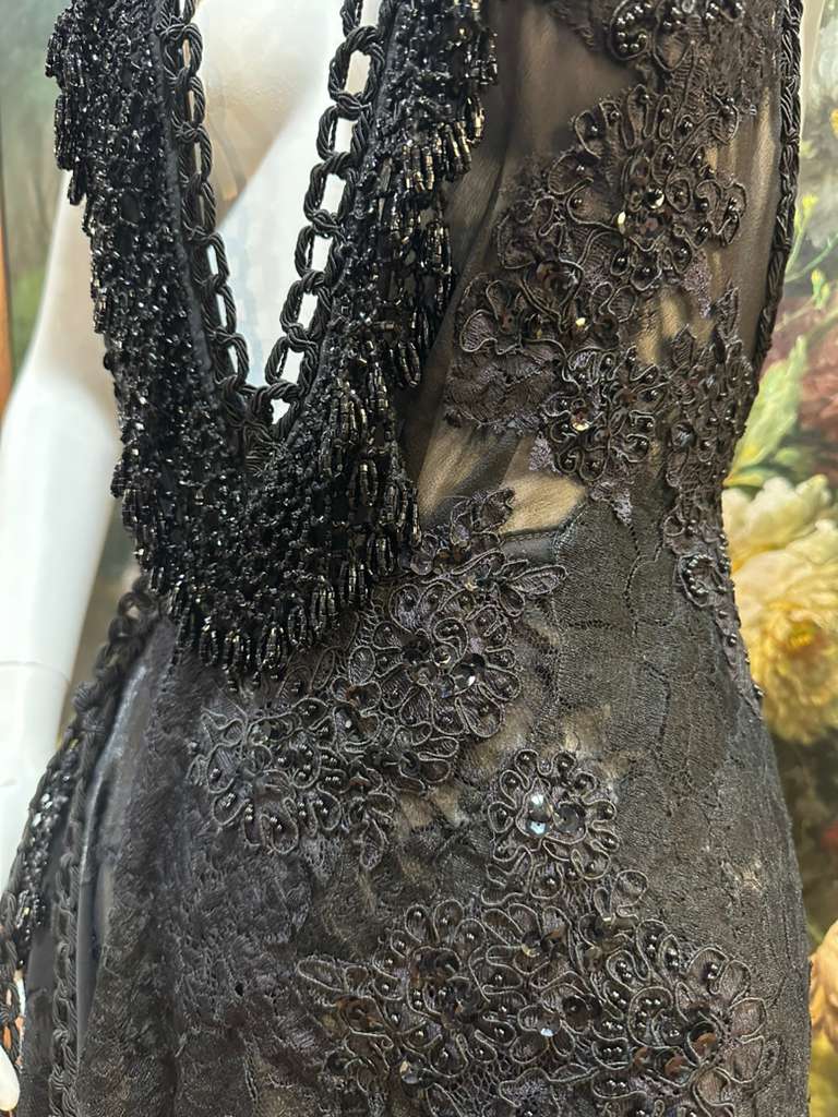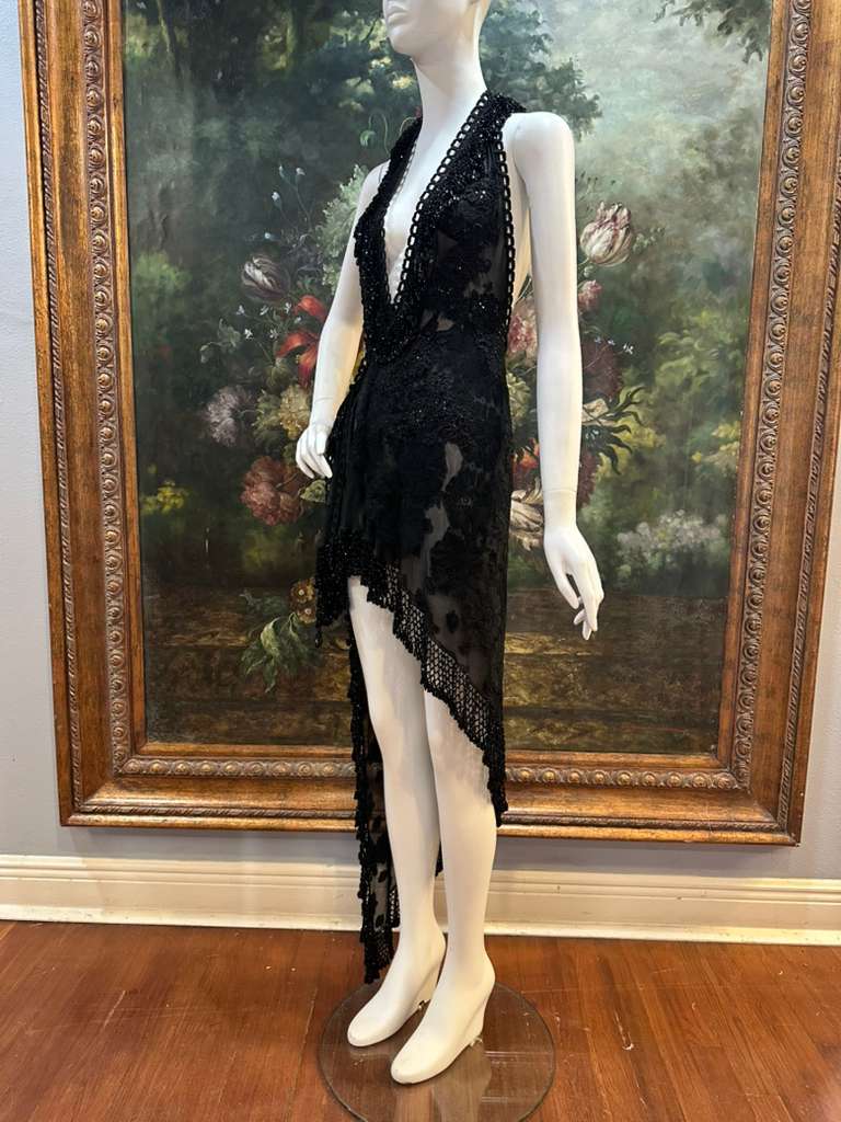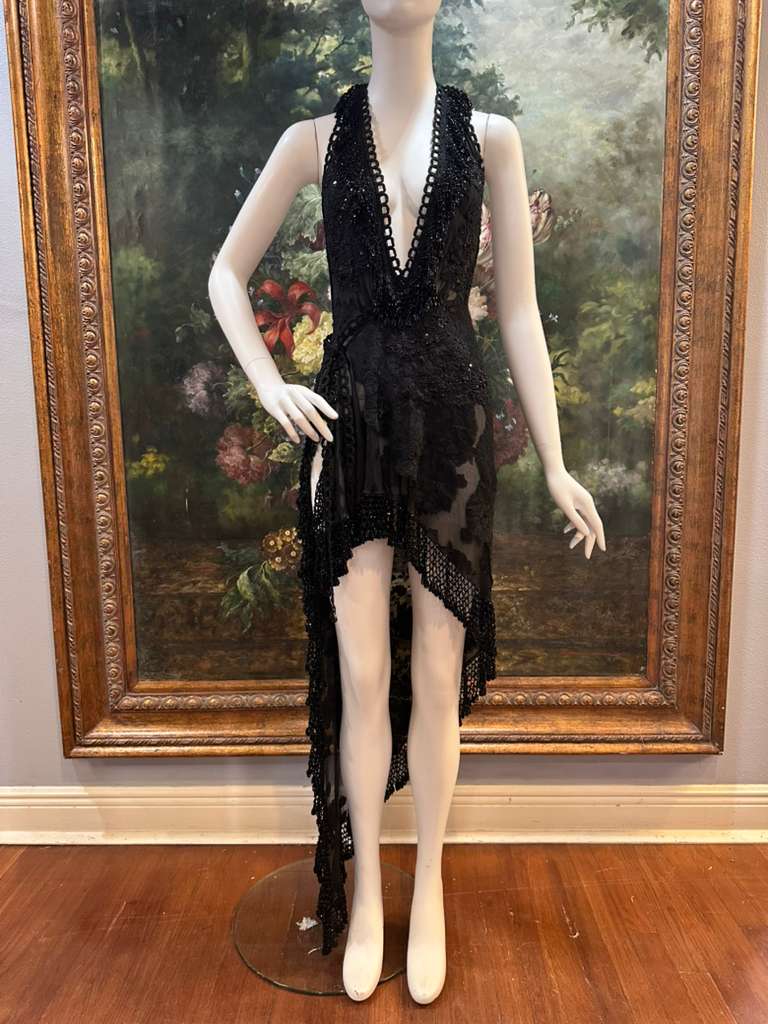 MORPHEW ATELIER Black Sheer Lace Antique Beaded Fringe Halter Cocktail Dress