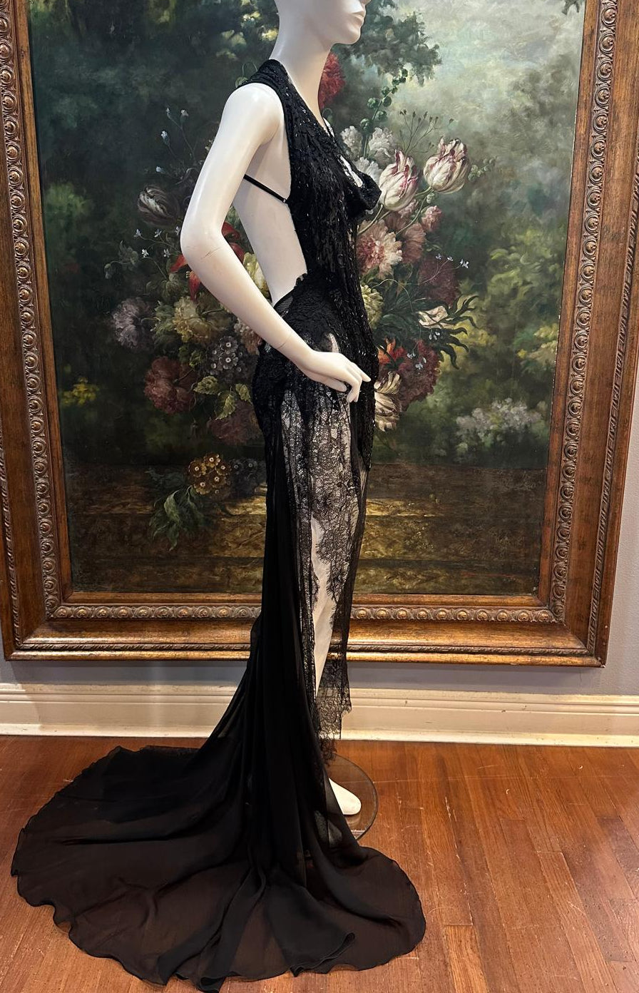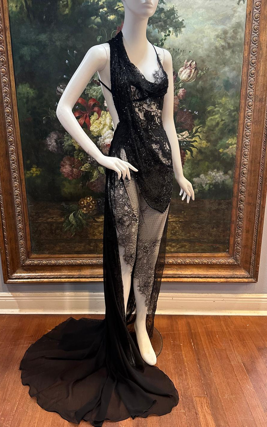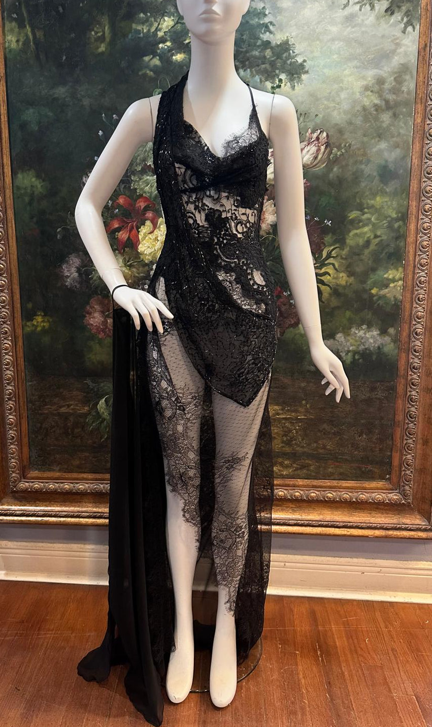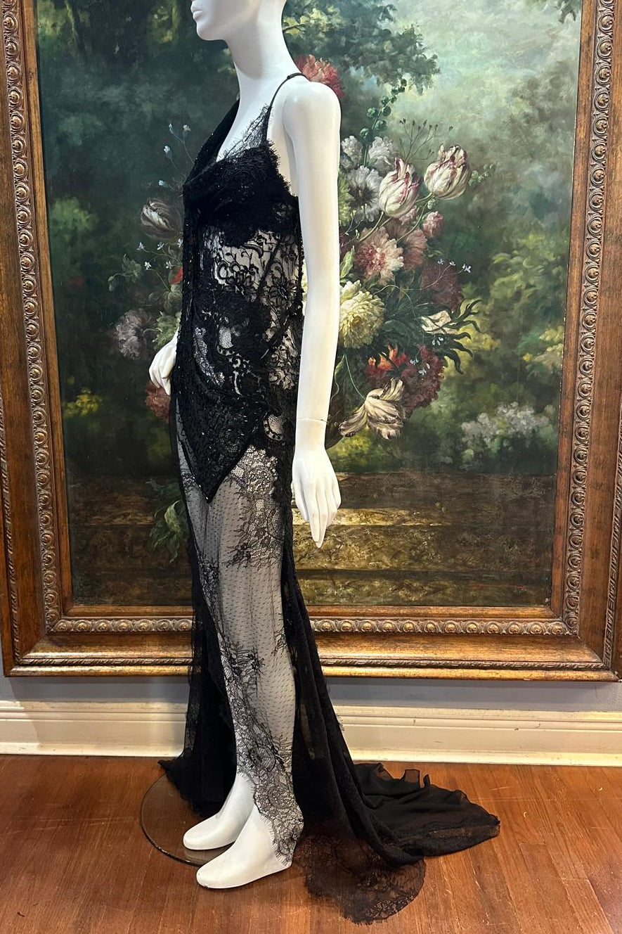 Black Silk Chiffon & Antique Lace Beaded Gown