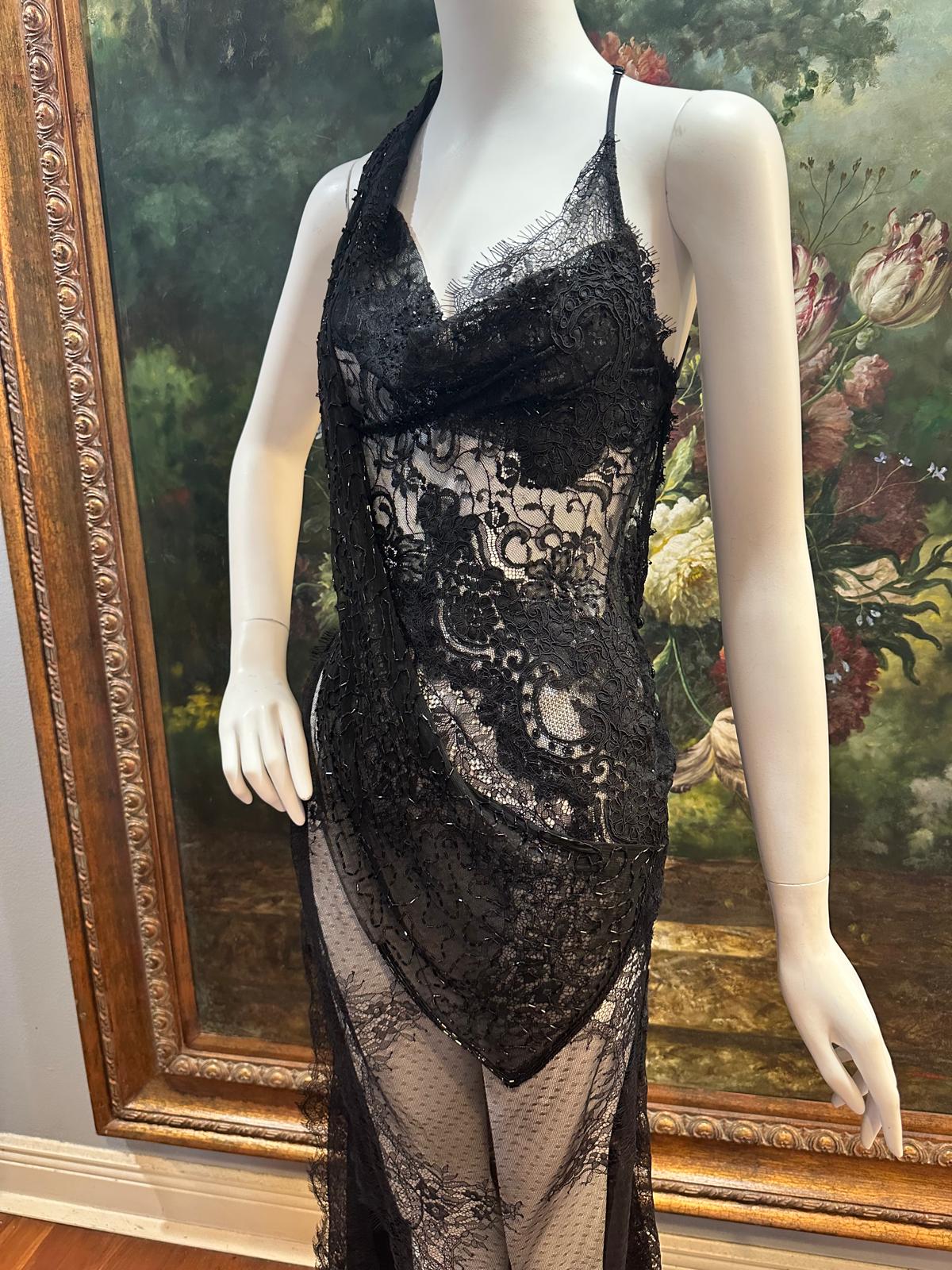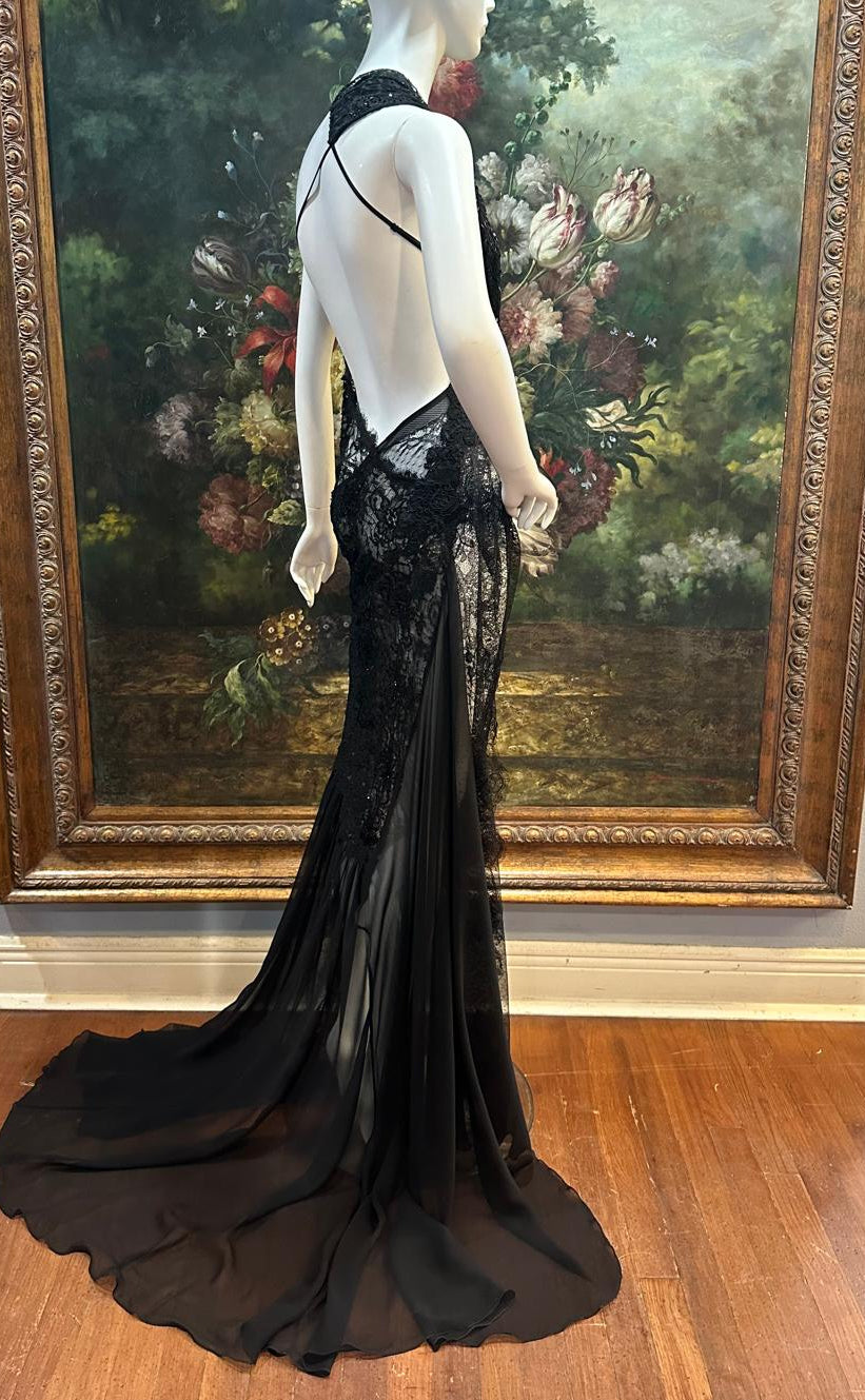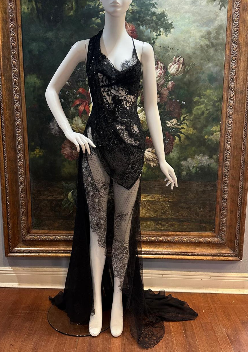 Black Silk Chiffon & Antique Lace Beaded Gown