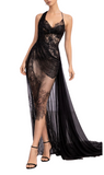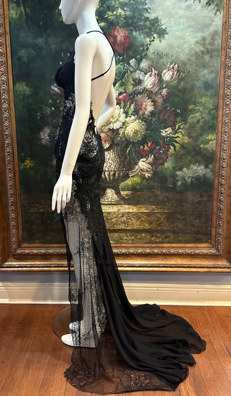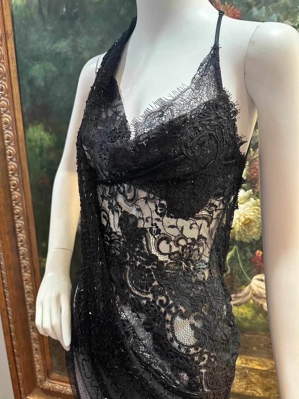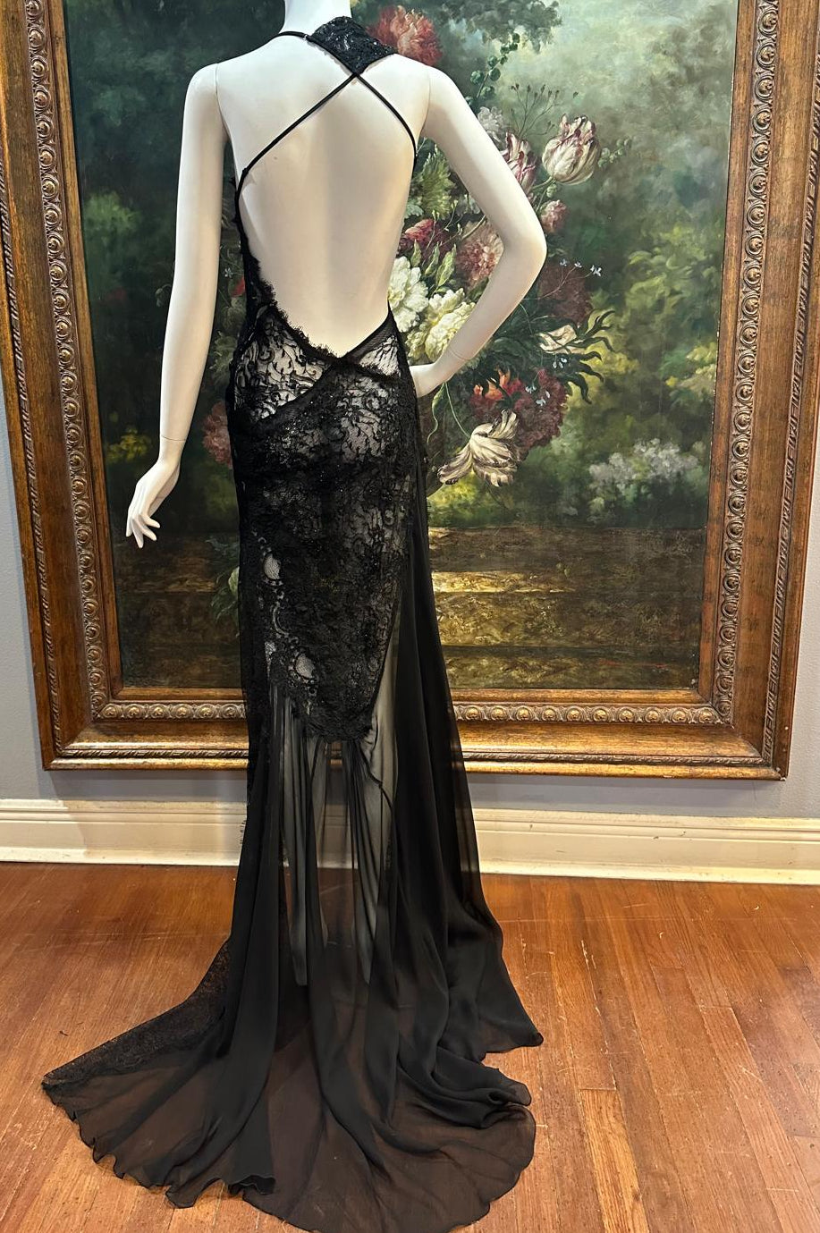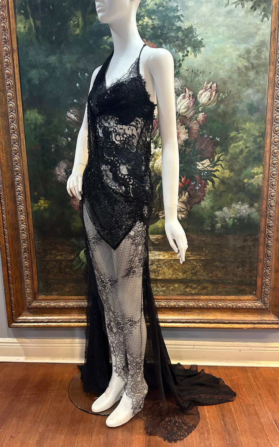 Black Silk Chiffon & Antique Lace Beaded Gown