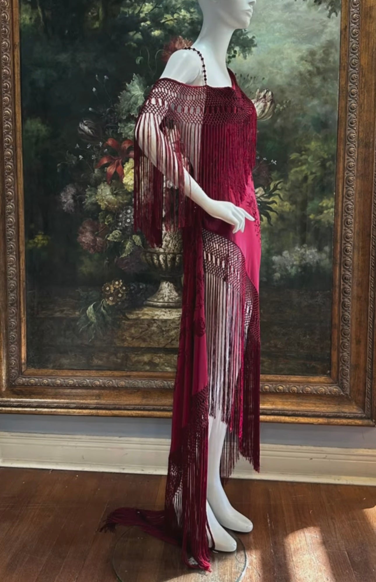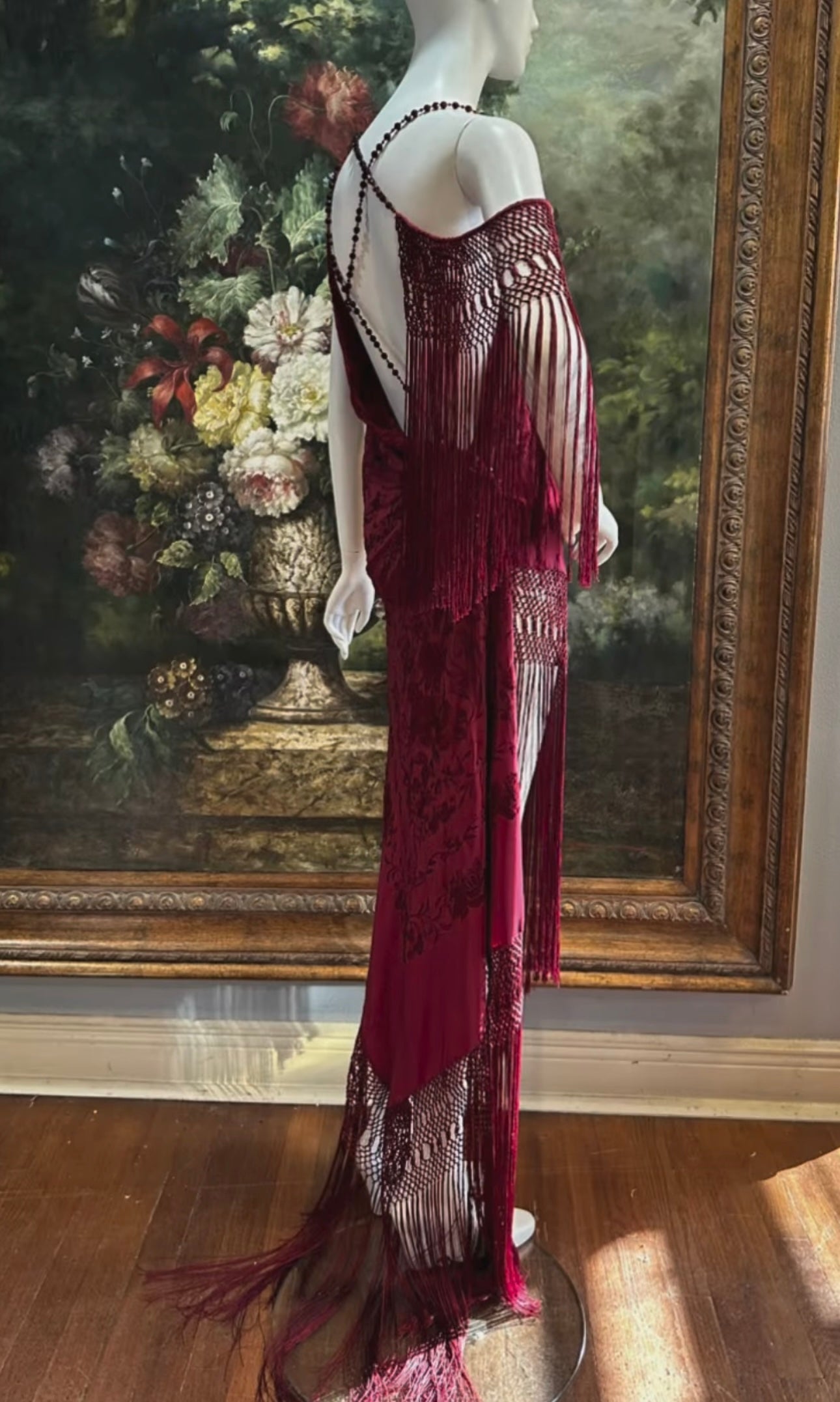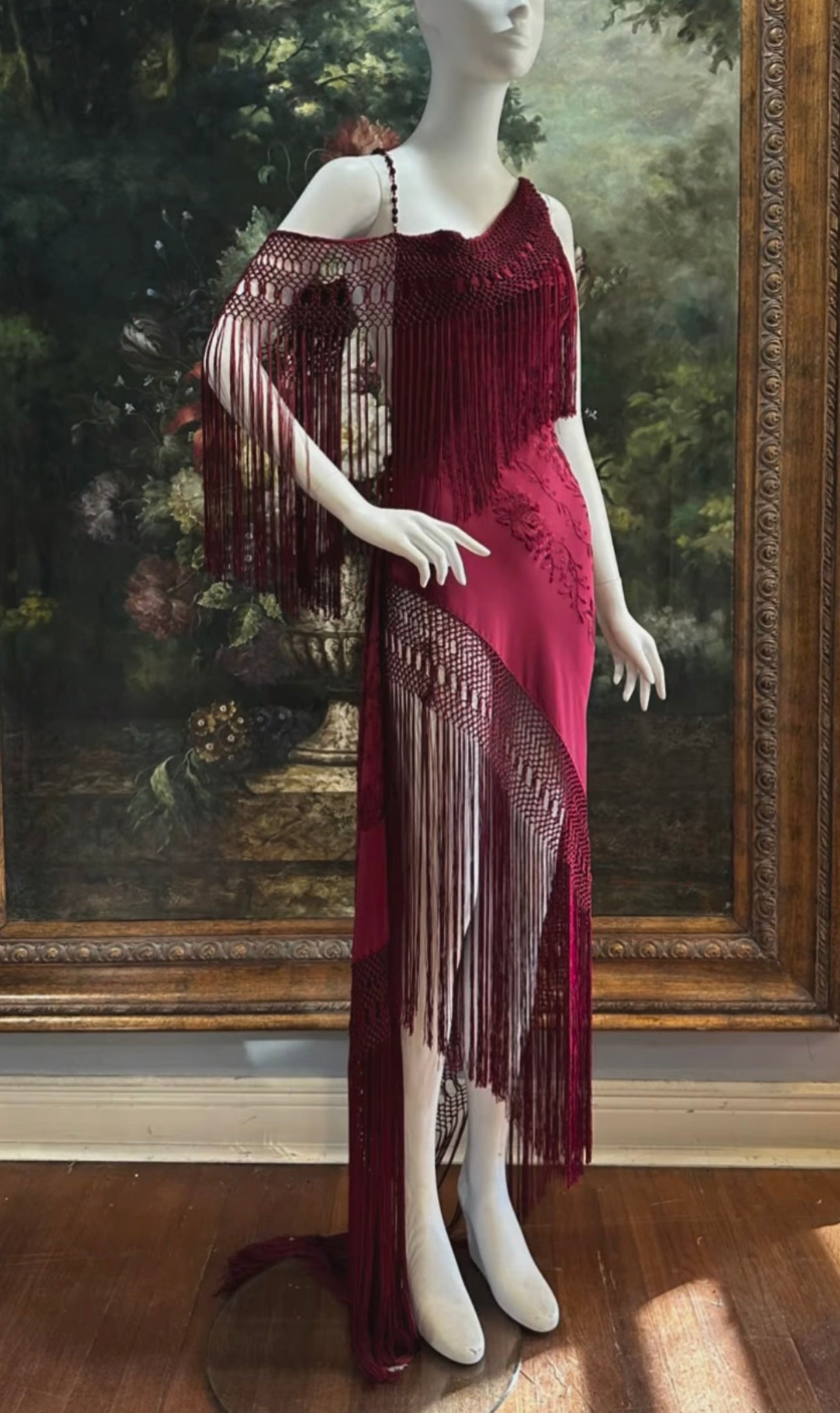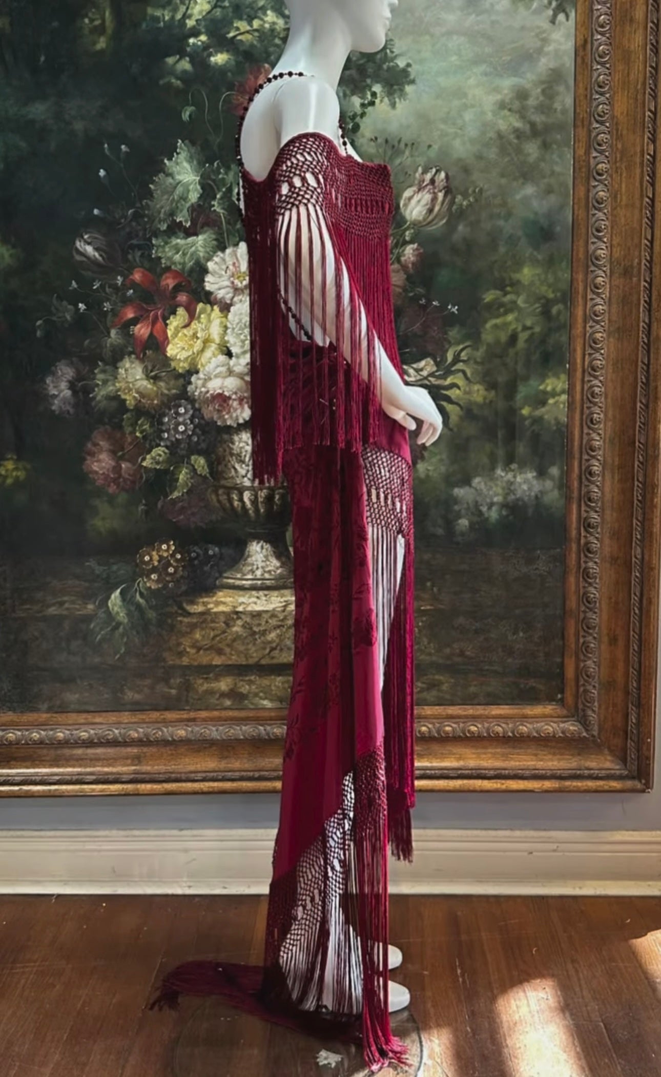 MORPHEW ATELIER Burgundy Crochet Fringe Dress with Beaded Straps