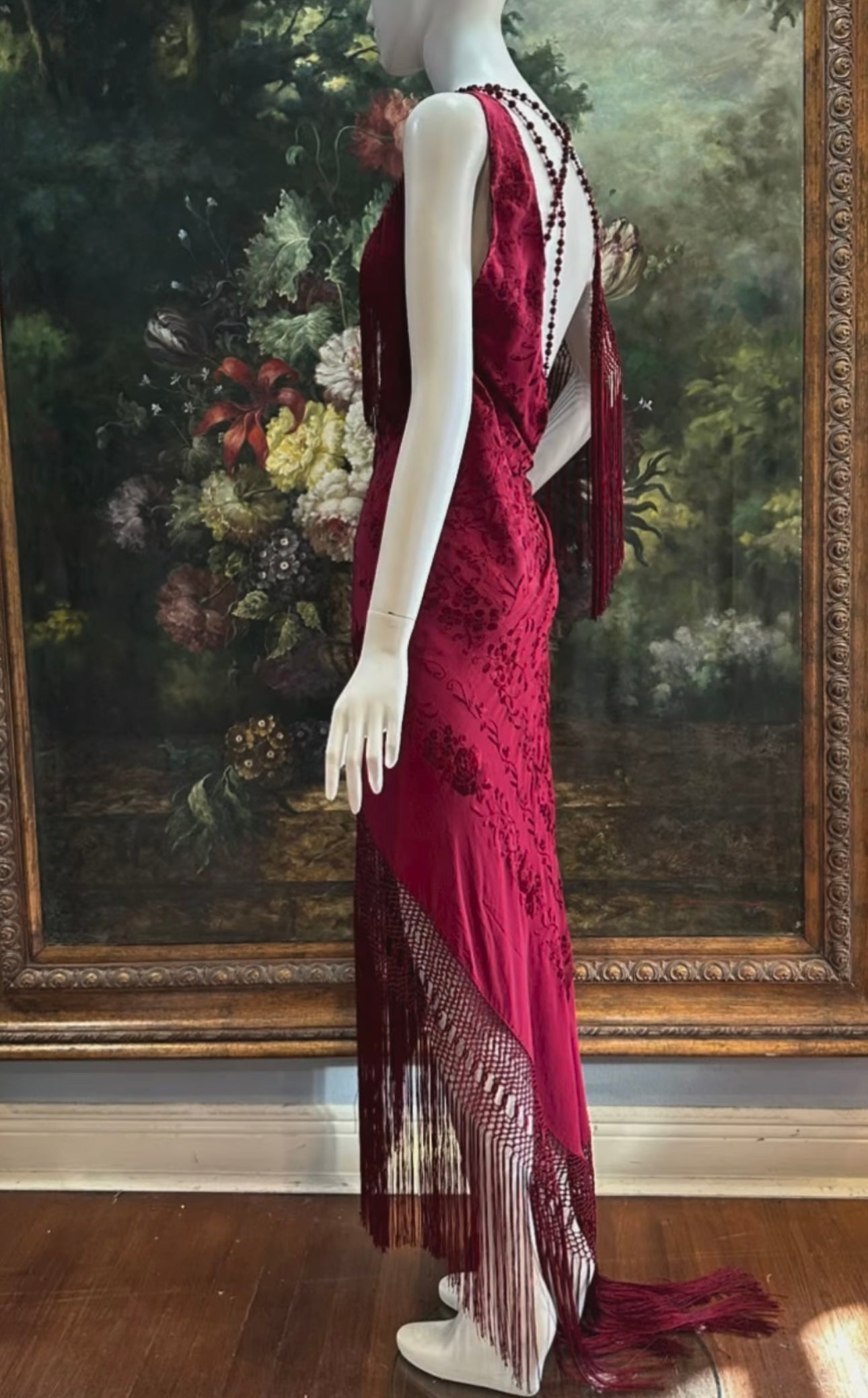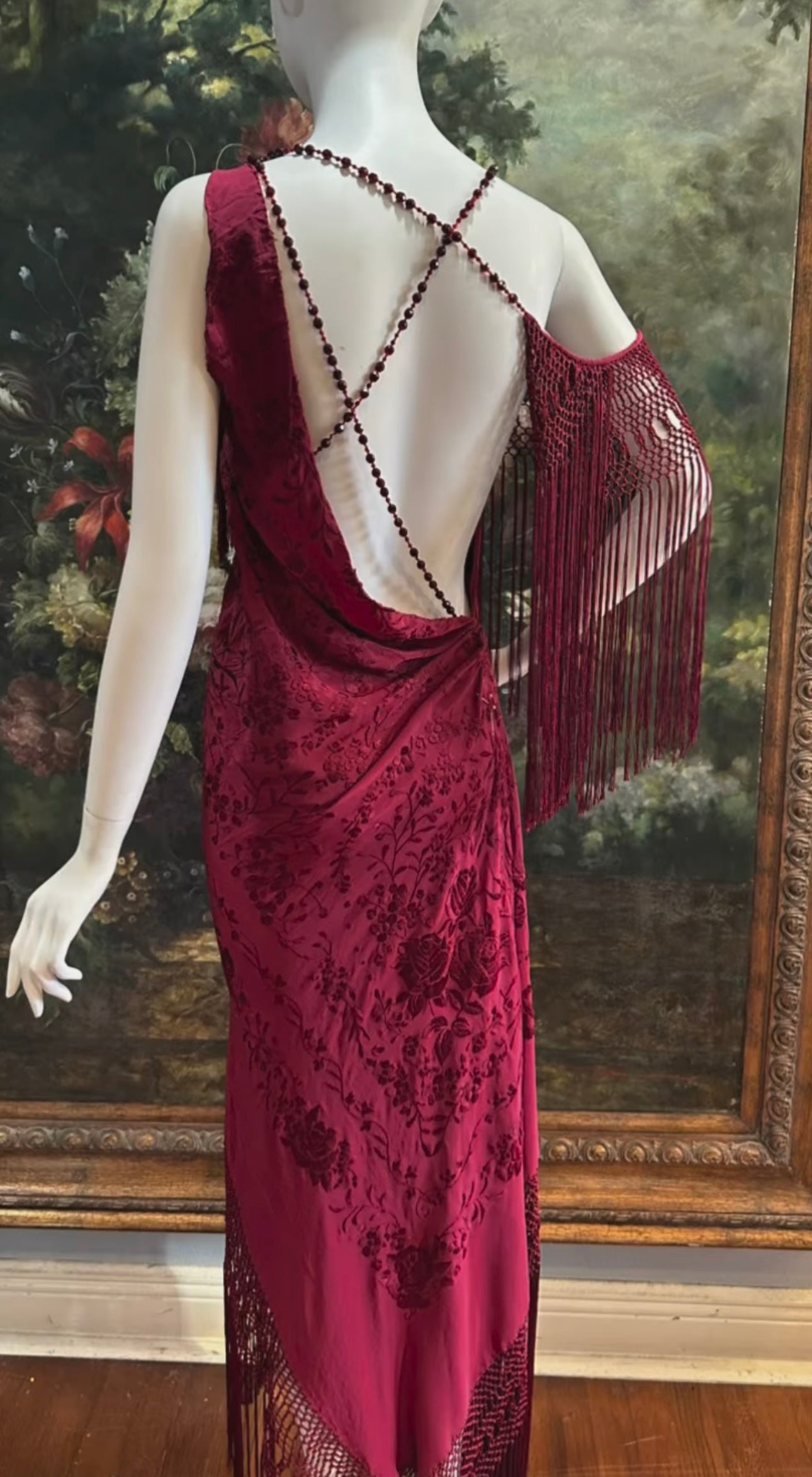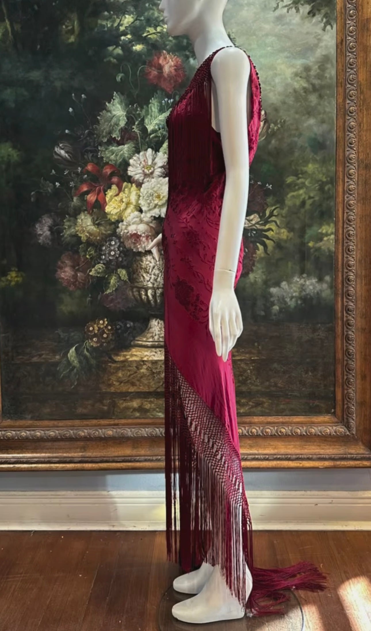 MORPHEW ATELIER Burgundy Crochet Fringe Dress with Beaded Straps