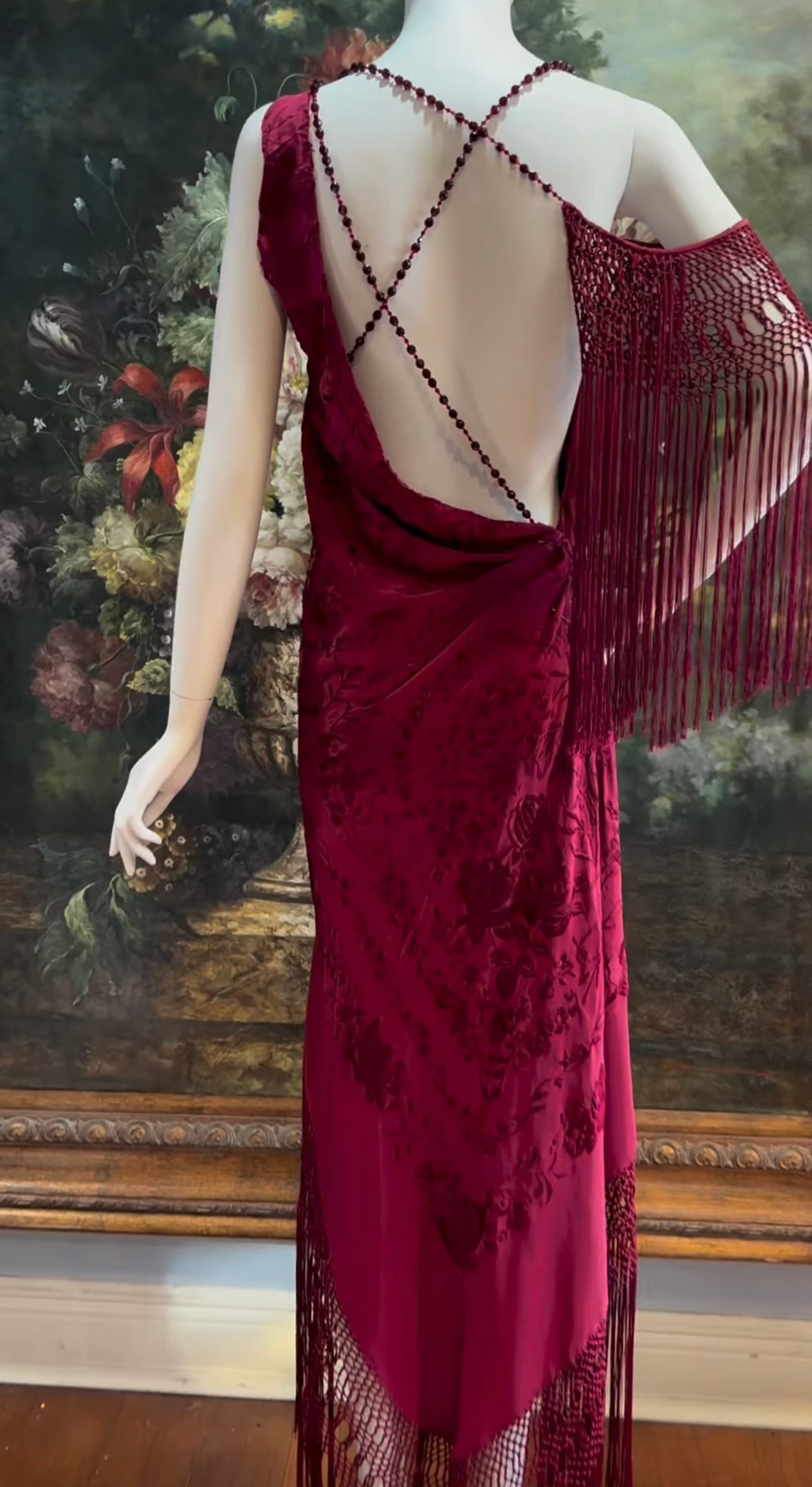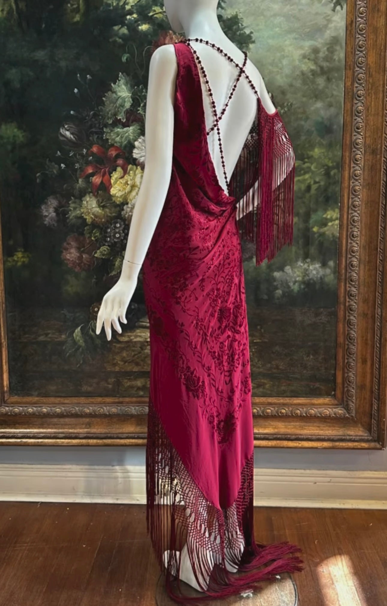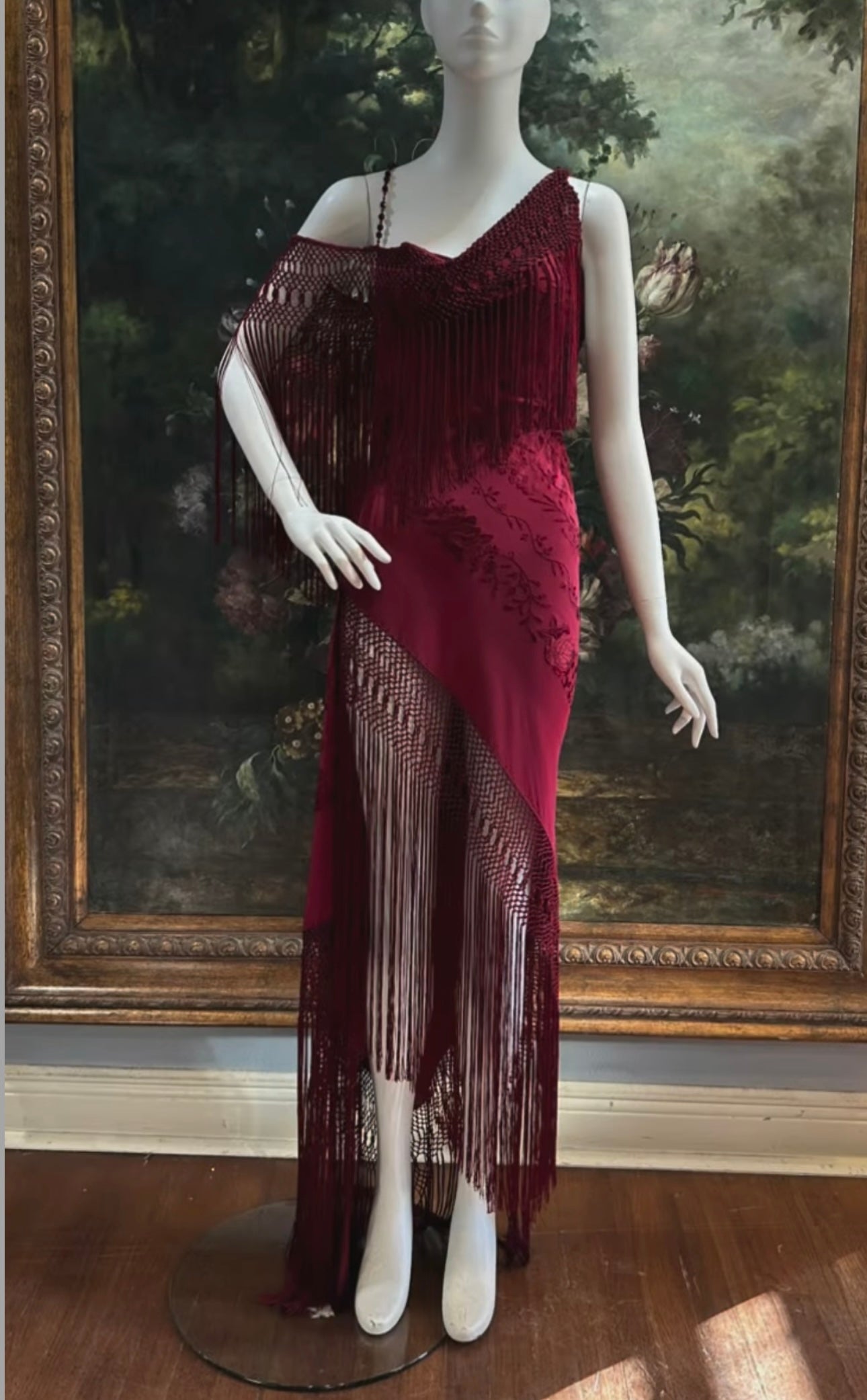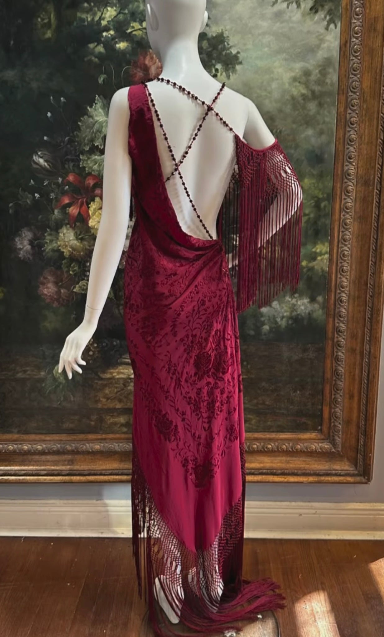 MORPHEW ATELIER Burgundy Crochet Fringe Dress with Beaded Straps