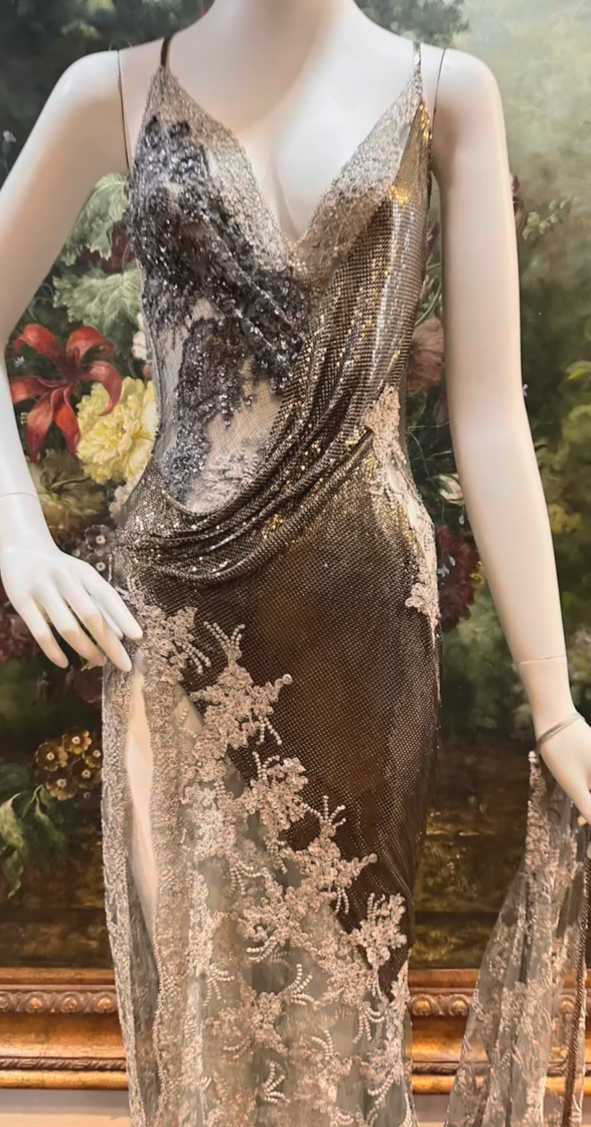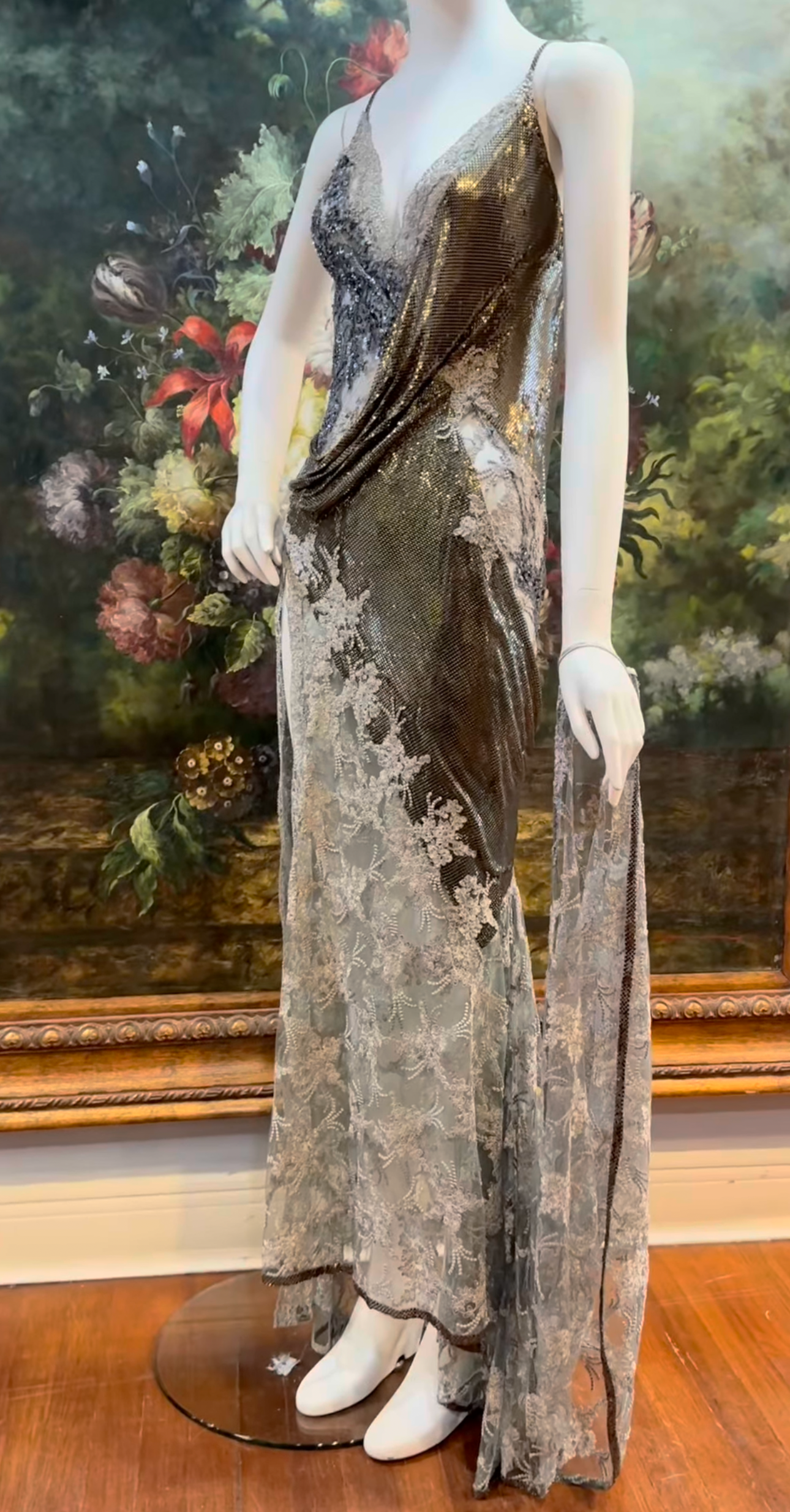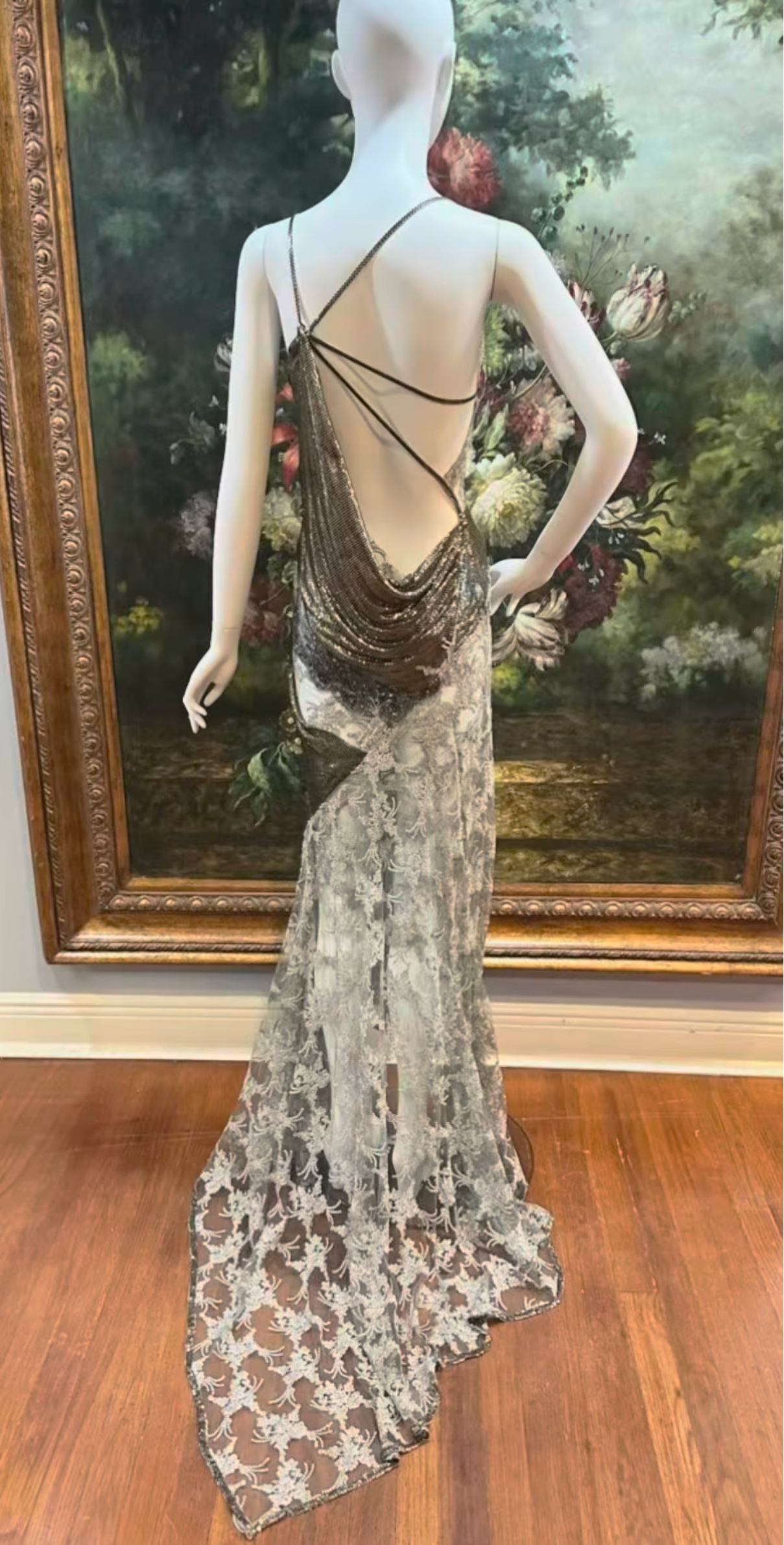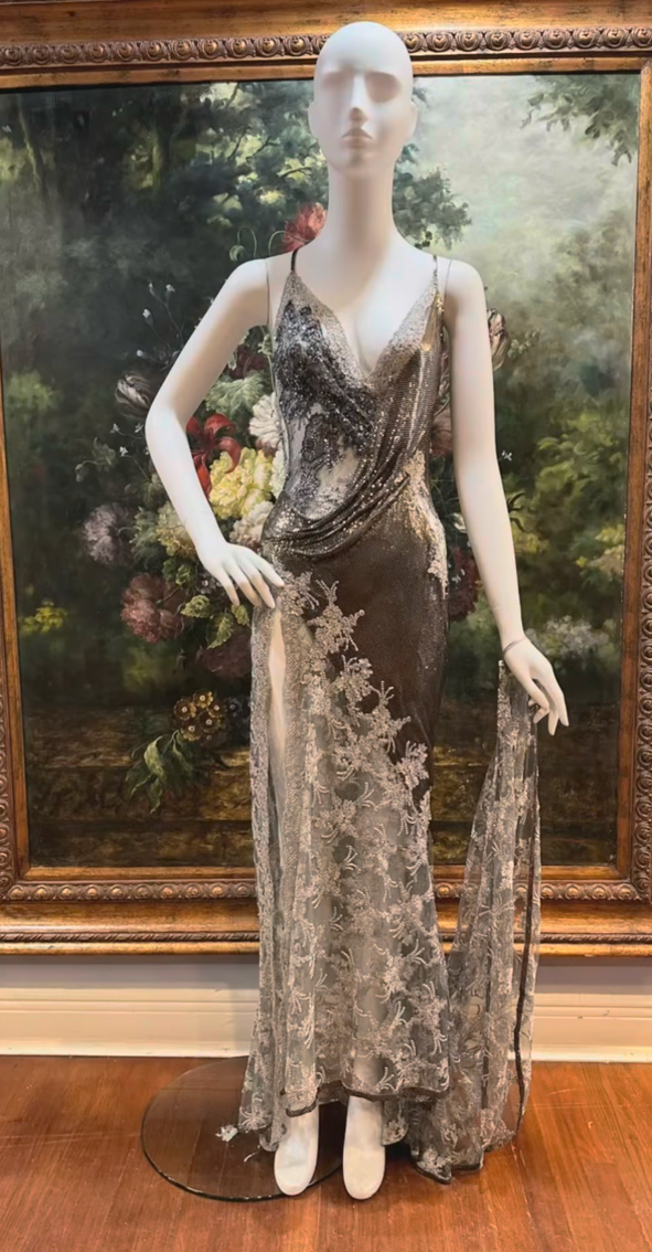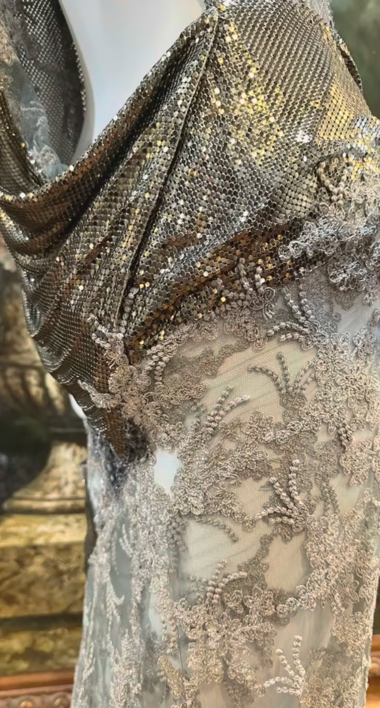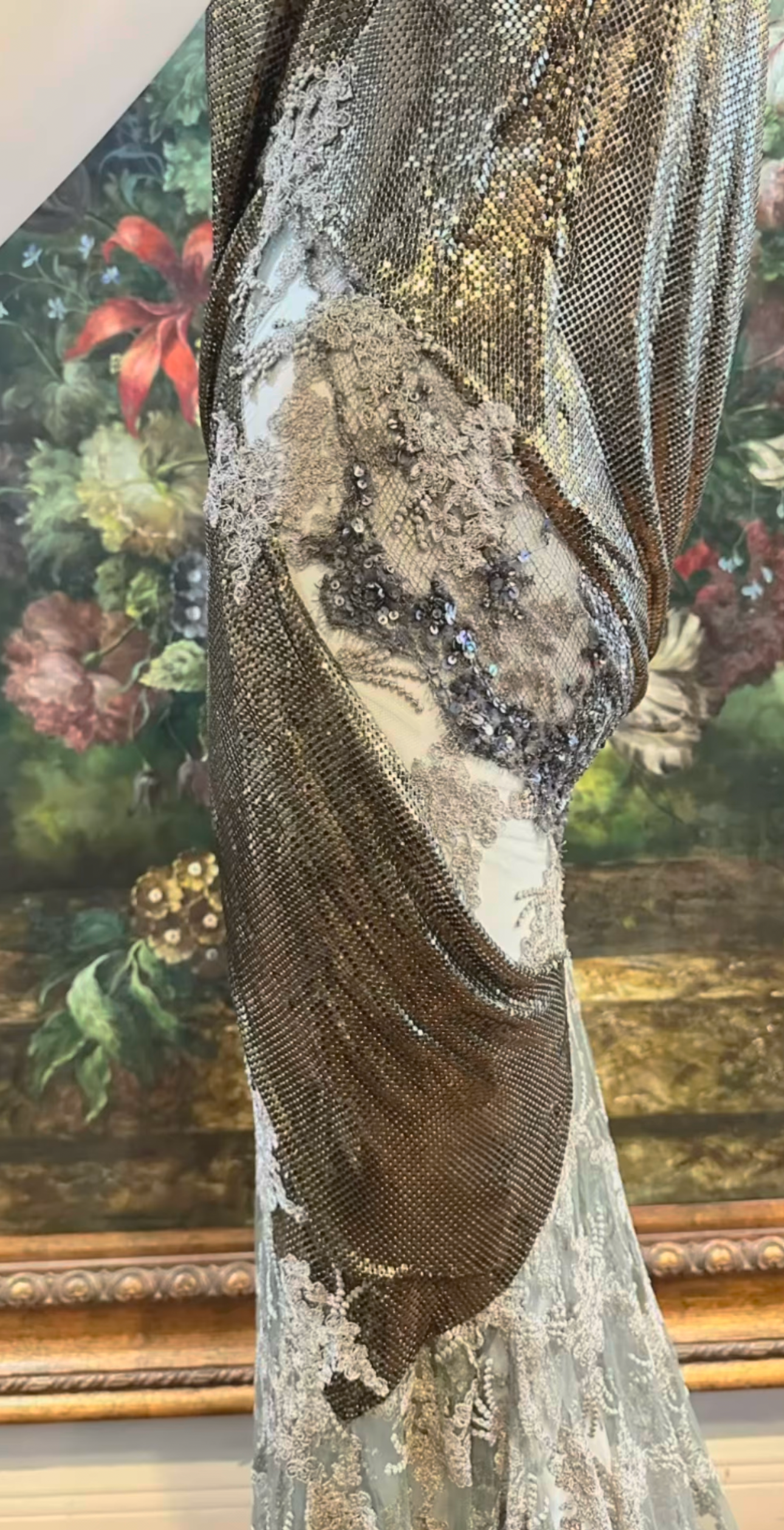 Stormy Grey Metallic Lace & Metal Mesh Gown with Train Size 4