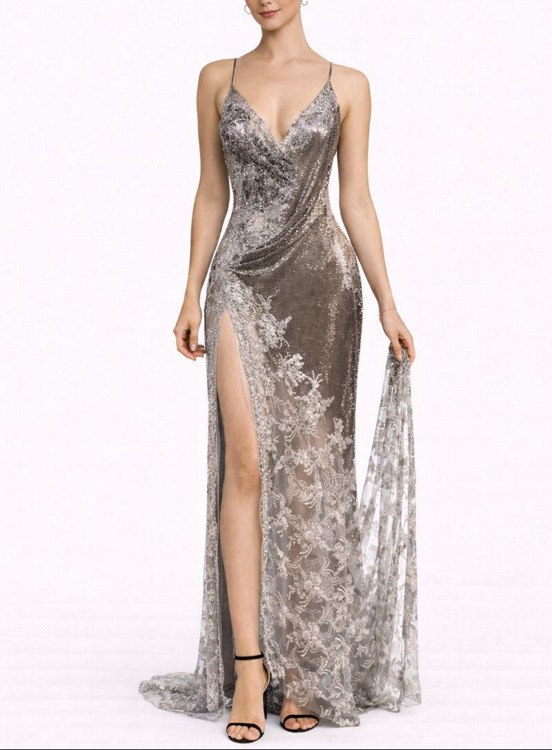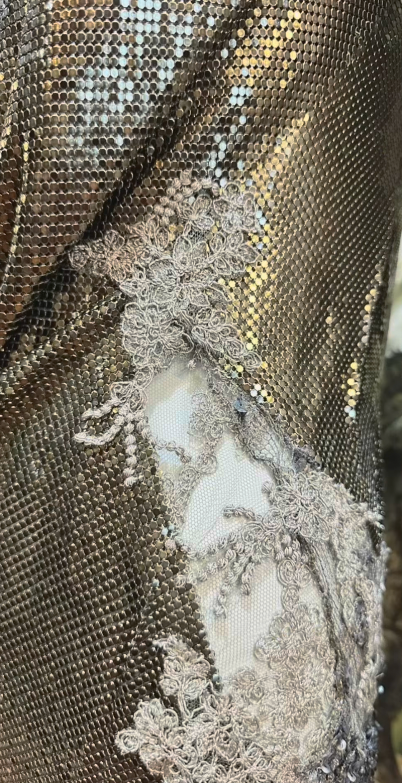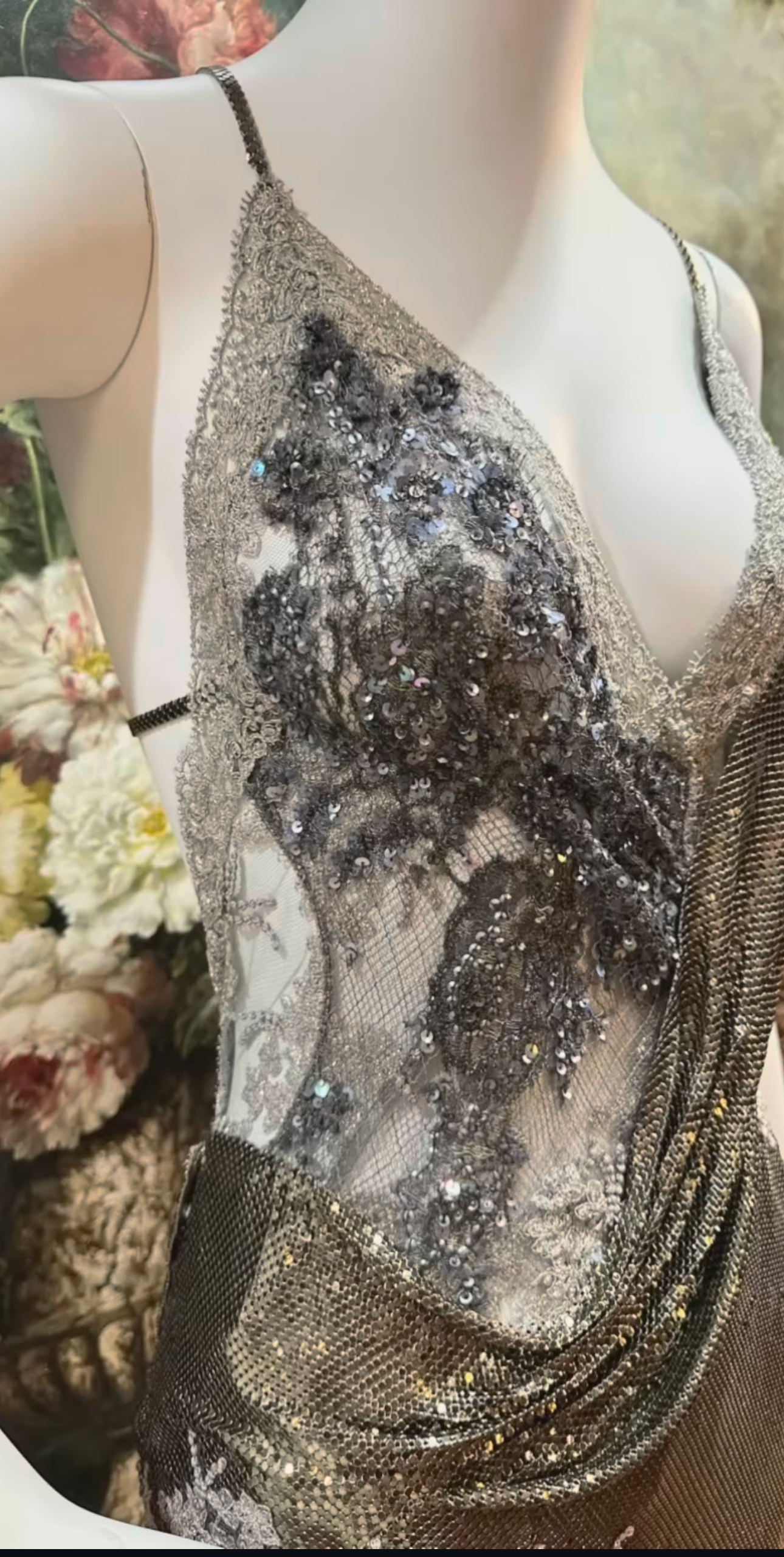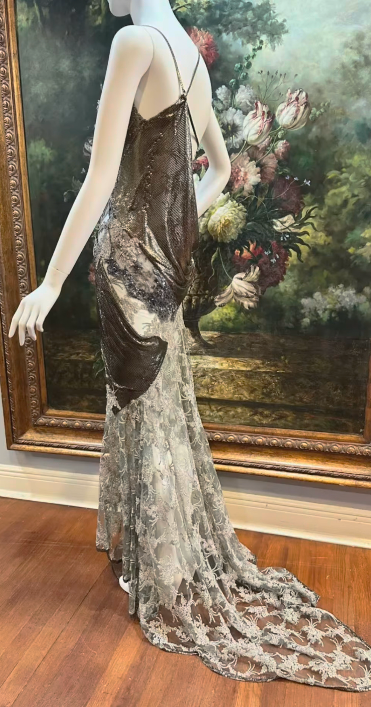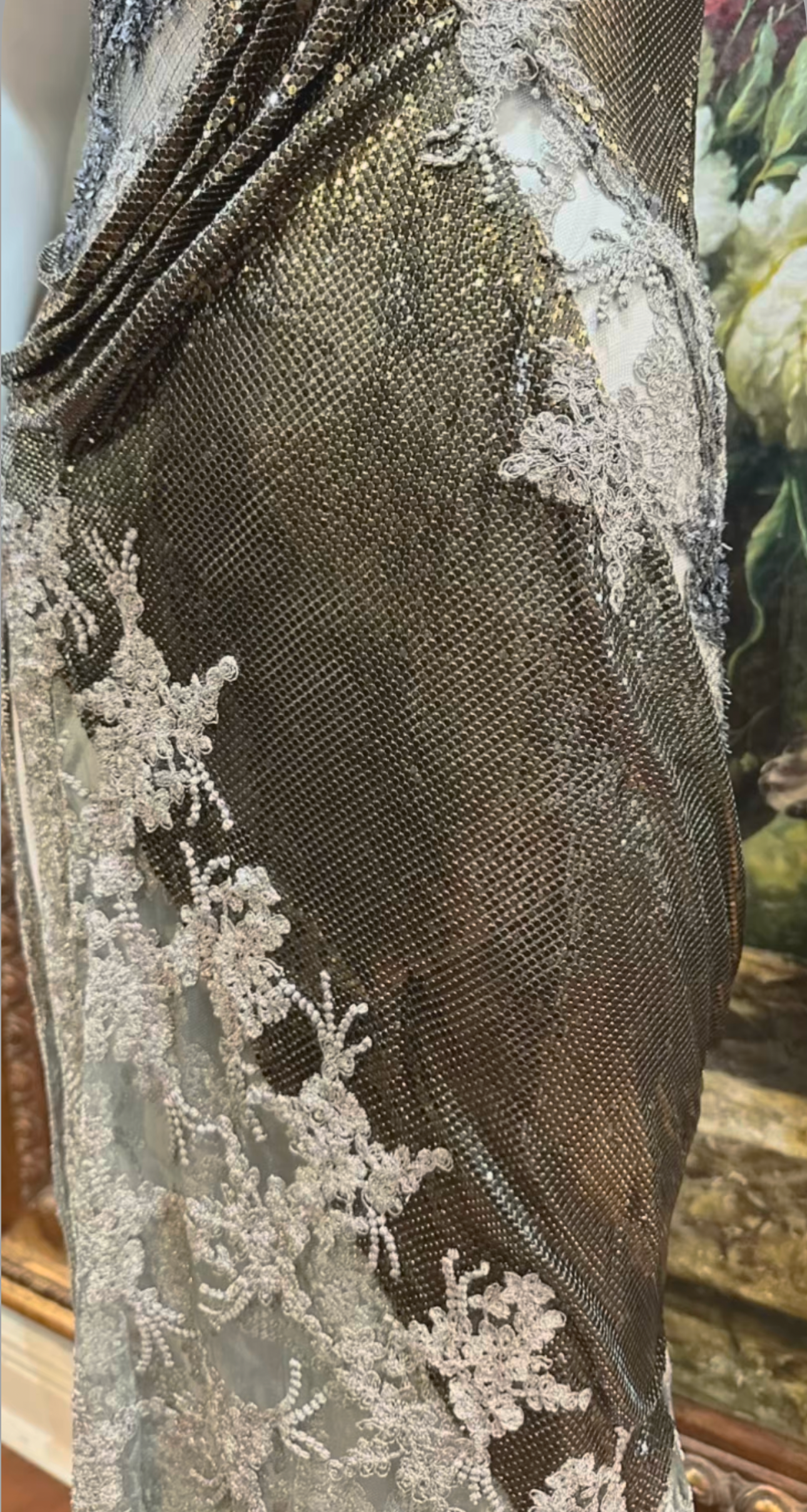 Stormy Grey Metallic Lace & Metal Mesh Gown with Train Size 4
