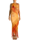 Amber & Red Hand Embroidered Silk Bias Cut Fringed Piano Shawl Gown