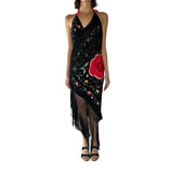 MORPHEW ATELIER Black Bias Cut Silk Crepe Hand-Embroidered Piano Shawl Gown With Fringe