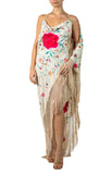 MORPHEW ATELIER Cream Silk Crepe Draped Sleeve Piano Shawl Gown Covered In Floral Embroidery With Fringe
