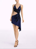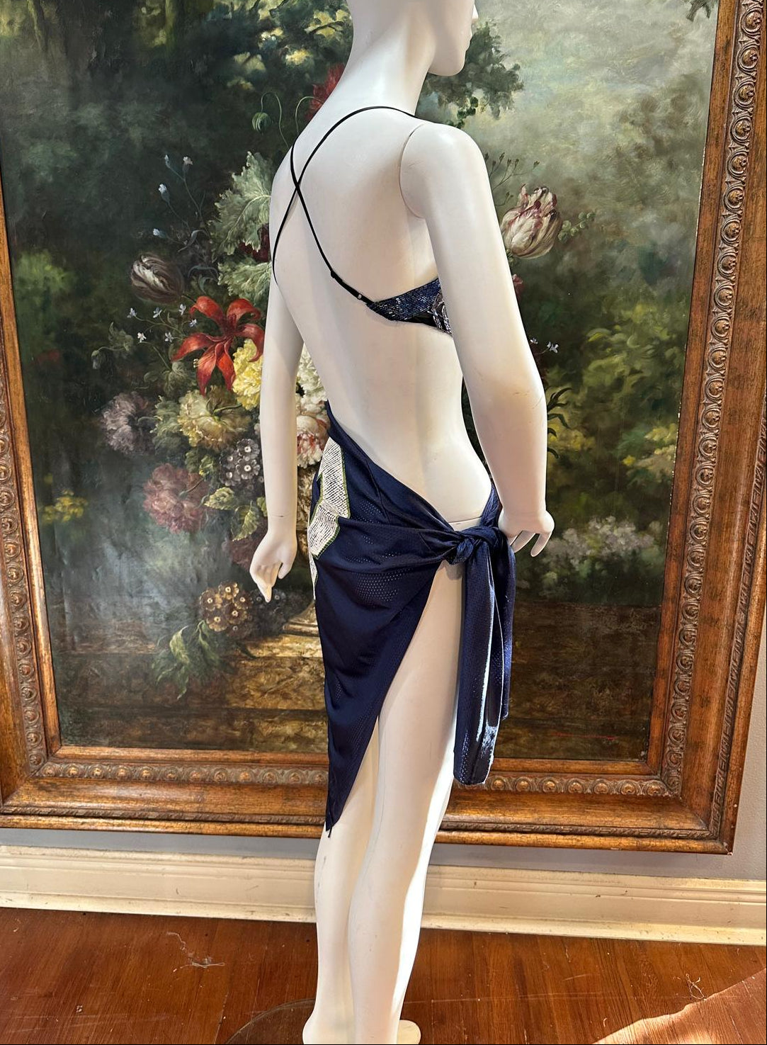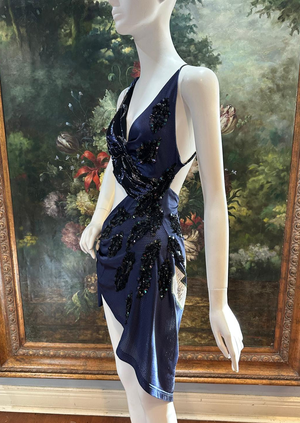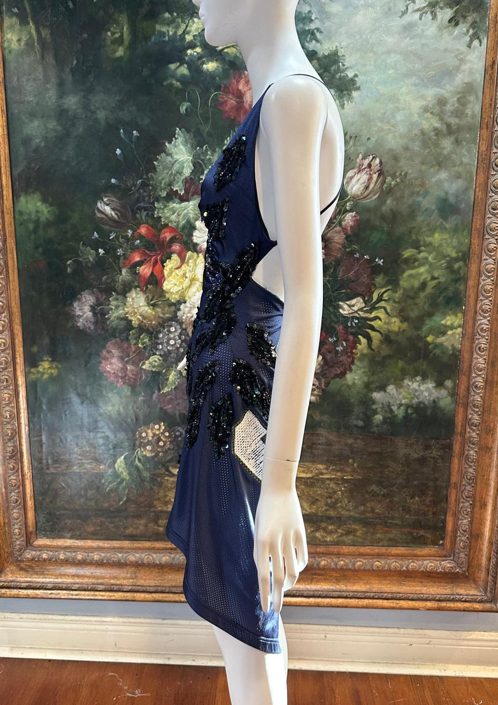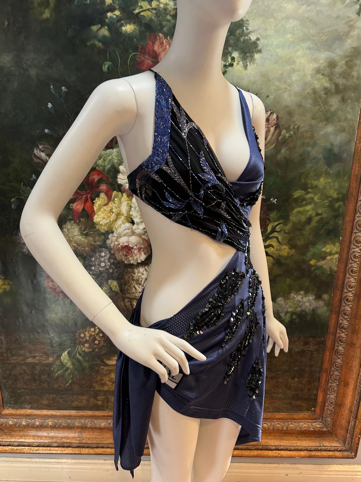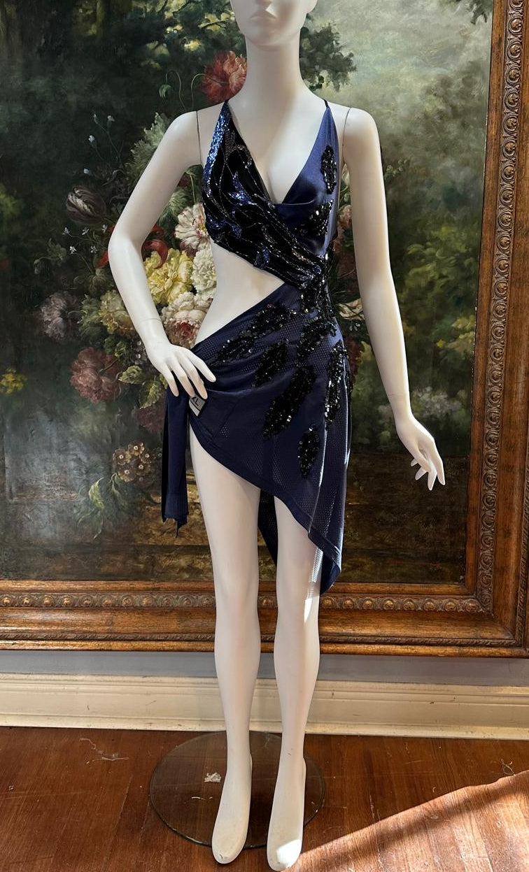 Navy Blue & Black Silk & Rayon Jersey Backless & Sequined #3 Dress with Hip Tie
