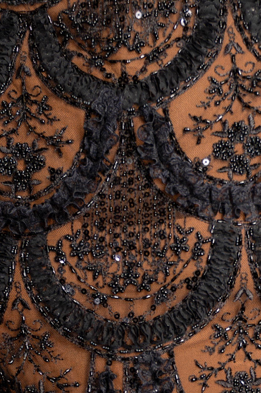 1990S Black & Brown Silk Lined Lace Beaded Cocktail Dress With Sequins Ruffles