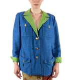 1990S Lime Green & Blue Linen Rayon Boxy Cut Nautical Blazer With Gold Buttons