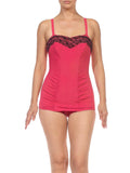 1950S Hot Pink & Black Rayon Blend Embroidered Sweetheart Neck Swimsuit