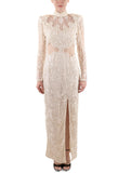 1980S Pearl White Slinky Beaded Lace Long Sleeved Gown With Sheer Panels