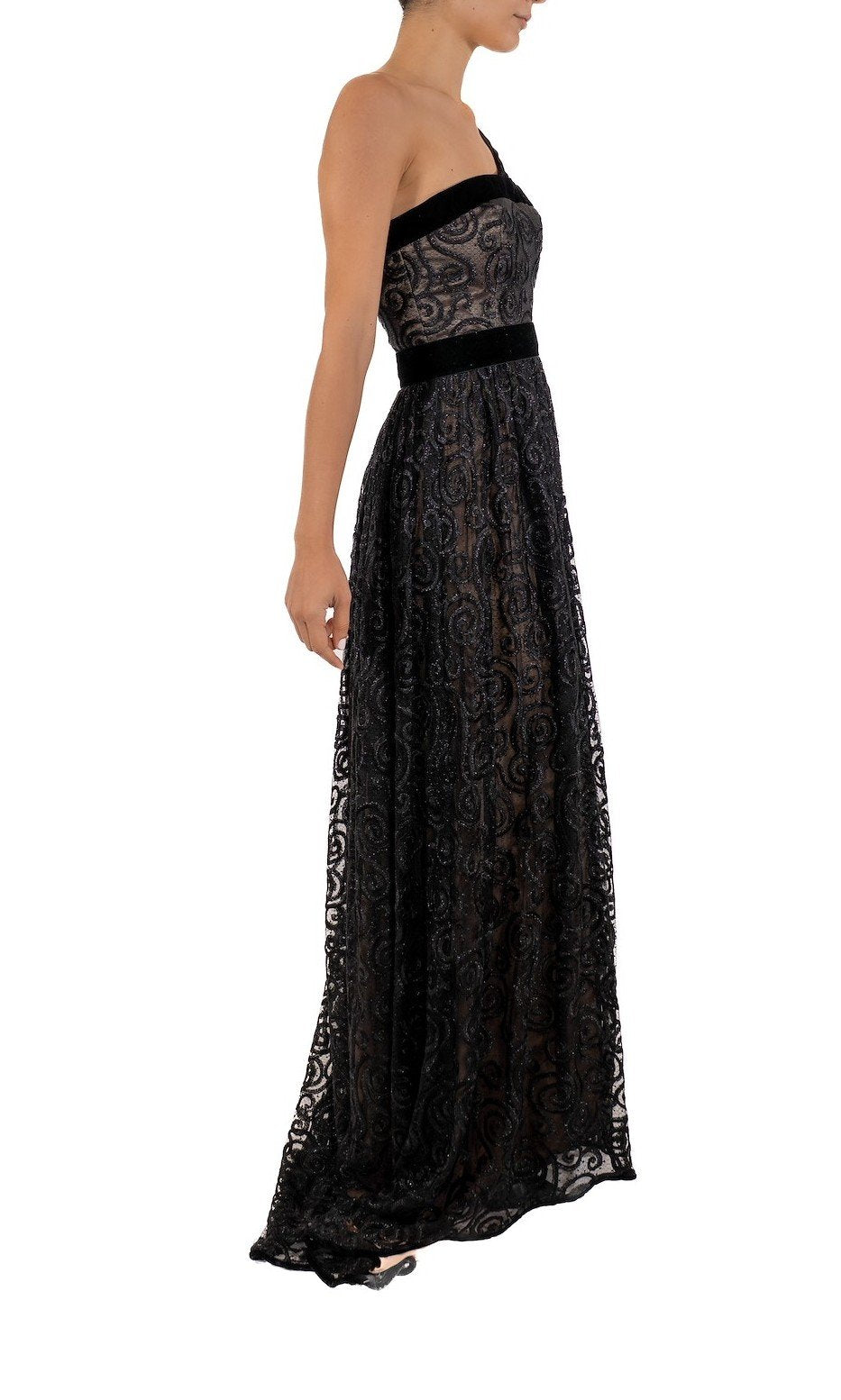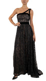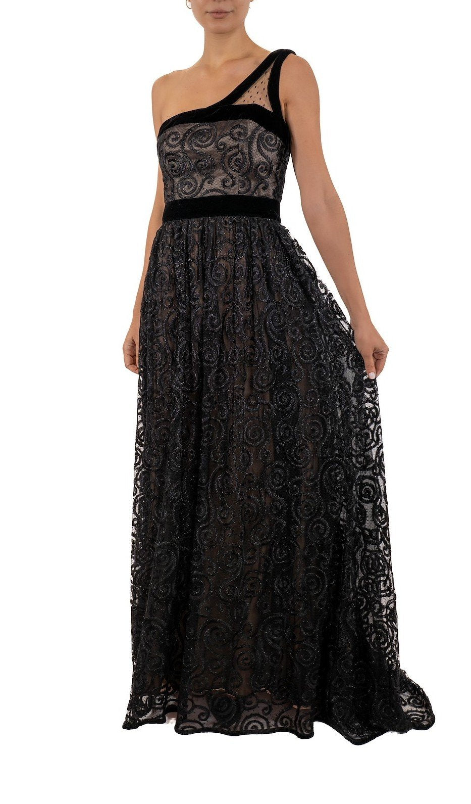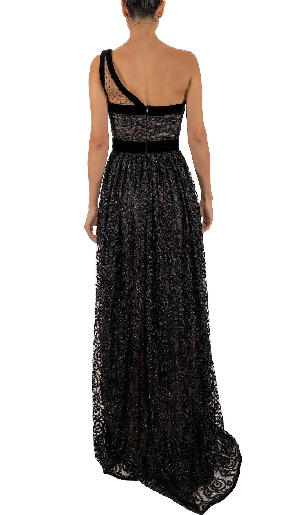 1990S Black Metallic Embroidered Nylon Lace One Shoulder Ball Gown