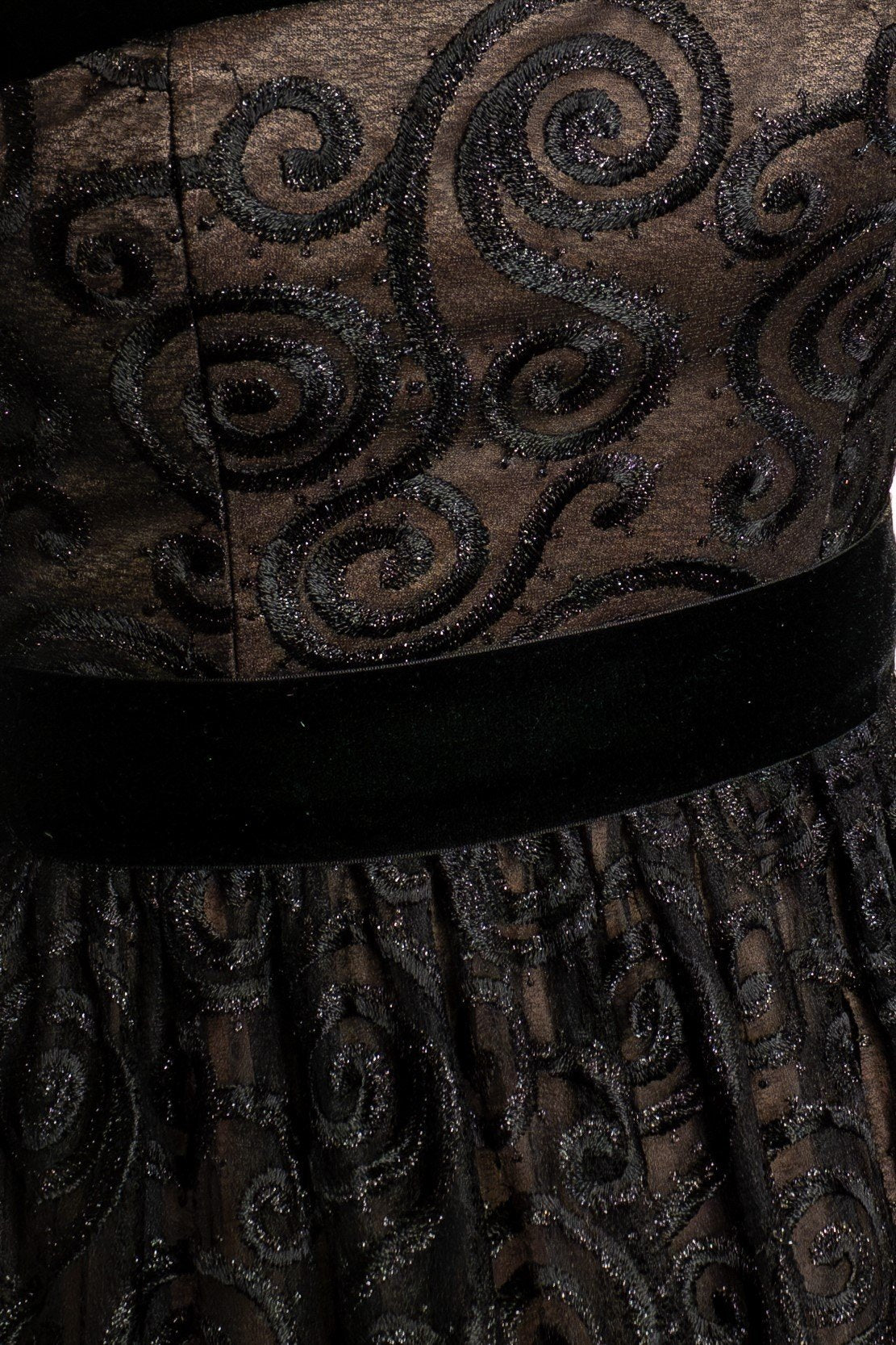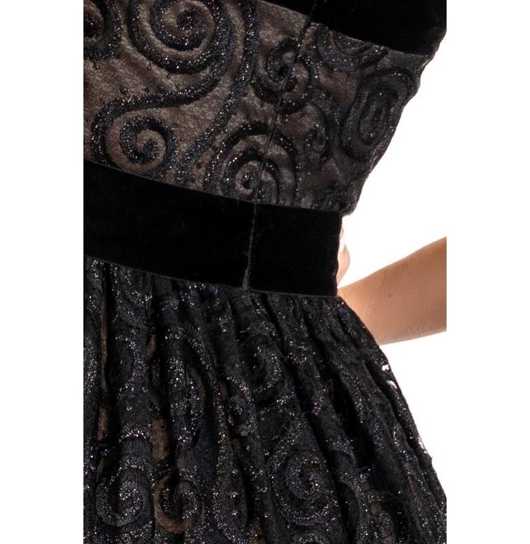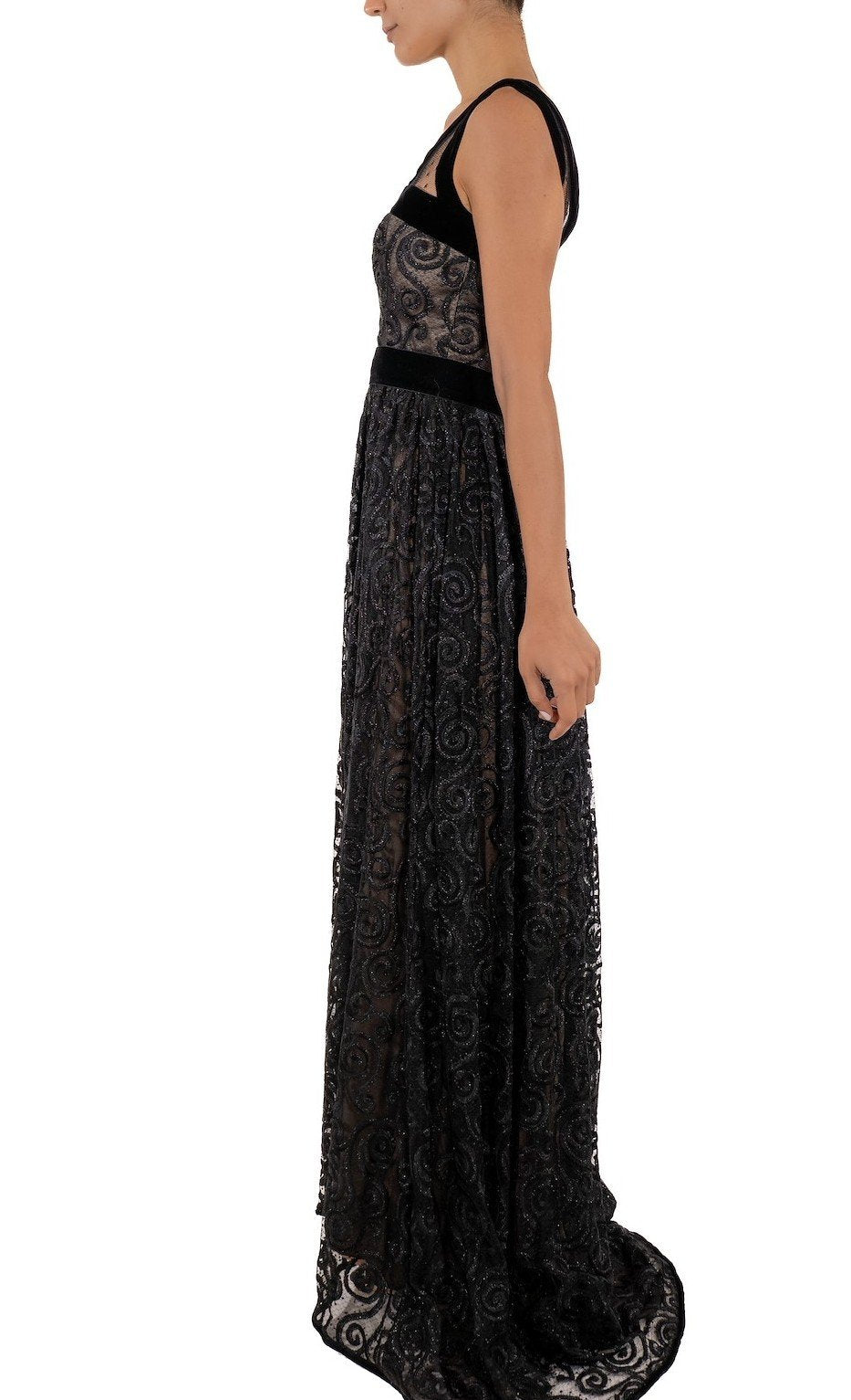 1990S Black Metallic Embroidered Nylon Lace One Shoulder Ball Gown